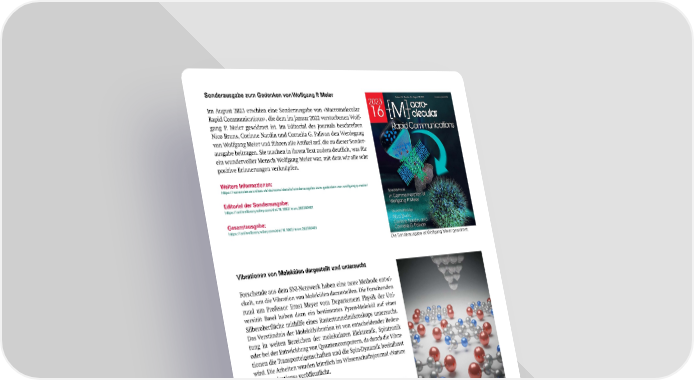Sonderausgabe zum Gedenken von Wolfgang P. Meier Im August 2023 erschien eine Sonderausgabe von «Macromolecular Rapid Communications», die dem im Januar 2022 verstorbenen Wolf- gang P. Meier gewidmet ist. Im Editorial des Journals beschreiben Nico Bruns, Corinne Nardin und Cornelia G. Palivan den Werdegang von Wolfgang Meier und führen alle Artikel auf, die zu dieser Sonder- ausgabe beitragen. Sie machen in ihrem Text zudem deutlich, was für ein wundervoller Mensch Wolfgang Meier war, mit dem wir alle sehr positive Erinnerungen verknüpfen. Weitere Informationen: https://nanoscience.unibas.ch/de/news/details/sonderausgabe-zum-gedenken-von-wolfgang-p-meier/ Editorial der Sonderausgabe: https://onlinelibrary.wiley.com/doi/10.1002/marc.202300401 Gesamtausgabe: https://onlinelibrary.wiley.com/doi/10.1002/marc.202300401 Die Sonderausgabe ist Wolfgang Meier gewidmet. Vibrationen von Molekülen dargestellt und untersucht Forschende aus dem SNI-Netzwerk haben eine neue Methode entwi- ckelt, um die Vibration von Molekülen darzustellen. Die Forschenden rund um Professor Ernst Meyer vom Departement Physik der Uni- versität Basel haben dazu ein bestimmtes Pyren-Molekül auf einer Silberober昀氀äche mithilfe eines Rastertunnelmikroskops untersucht. Das Verständnis der Molekülvibration ist von entscheidender Bedeu- tung in weiten Bereichen der molekularen Elektronik, Spintronik oder bei der Entwicklung von Quantencomputern, da durch die Vibra- tionen die Transporteigenschaften und die Spin-Dynamik beein昀氀usst wird. Die Arbeiten wurden kürzlich im Wissenschaftsjournal «Nature Communications» verö昀昀entlicht. Weitere Informationen: https://nanoscience.unibas.ch/de/news/details/vibrationen-von-molekuelen-dargestellt-und-untersucht/ Originalpublikation: https://www.nature.com/articles/s41467-023-41601-2 Ein TBTAP-Molekül auf einer Silberober昀氀äche ist zu- nächst negativ geladen. Wird an die Spitze eines Ras- tertunnelmikroskops (STM) eine positive Spannung angelegt und diese nah an das Molekül gebracht, kommt es zu einer Entladung des Moleküls. Diese Entladung geschieht nicht in einem Zug, sondern oszillierend. (Ani- mation: Departement Physik, Universität Basel) Chrom ersetzt seltene und teure Edelmetalle Wenn Bildschirme leuchten oder Solarenergie in Brennsto昀昀e 昀氀iesst, stecken oft teure Edelmetalle dahinter. Chemikerinnen und Chemi- kern der Universität Basel ist es gelungen, diese seltenen Elemente mit einem deutlich kostengünstigeren Metallelement zu ersetzen. Die Eigenschaften der neuen Materialien kommen denjenigen der bisher verwendeten sehr nahe. Weitere Informationen: https://chemie.unibas.ch/de/news/details/chrom-ersetzt-seltene-und-teure-edelmetalle/ Modernste Chrom-Verbindungen als Leuchtstoffe und Originalpublikation: Katalysatoren. (Bild: Universität Basel, Jo Richers) https://www.nature.com/articles/s41557-023-01297-9 26 SNI INSight Dezember 2023