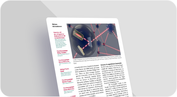 Weitere Informationen: Interview mit den erfolgreichen Professor:innen der Universität Basel https://www.unibas.ch/de/ Universitaet/Administration- Services/Vizerektorat- Forschung/Grants-Office/ Grants-Office-News/Grants- Office-Newsletter-2023-7/ Quantum.html Forschungsgruppe Philipp Treutlein https://atom.physik.unibas.ch/ en/research/ Forschungsgruppe In jedem Knotenpunkt des Quantennetzwerk soll eine Photonenquelle mit einem Quantenspeicher verknüpft werden. Richard Warburton Verschränkte Photonen sorgen dann für die Übermittlung der Information. (Abbildung: Departement Physik, Universität https://nano-photonics.unibas. Basel) ch Beitrag Physics «Siebenhundert dieser Dampfzellen konnten Sensoren für supraleitende Quantenbits World unsere Partner am CSEM bereits auf einem Für die Gruppe von Prof. Dr. Martino Poggio https://physicsworld.com/a/ Wafer produzieren», berichtet Philipp Treut- erlaubt die erhaltene Förderung die Fort- rubidium-vapour-makes-a- good-quantum-memory/ lein. «Wenn wir diese winzigen Quanten- setzung der Forschung auf dem Gebiet von speicher verwenden, werden die einzelnen Quantensensoren für supraleitende Quan- Forschungsgruppe Knoten des Netzwerks deutlich kleiner tenbits. Zwei Doktorierende und ein Postdoc Martino Poggio und wir können so theoretisch grössere treiben ab Dezember 2023 die vielverspre- https://poggiolab.unibas.ch Netzwerke aufbauen. Denkbar ist ebenfalls, chenden Forschungsarbeiten des Poggio Forschungsgruppe einzelne Knoten mit mehreren Dampfzellen Labs auf dem Gebiet der rastersondenmikro- Patrick Maletinsky auszustatten und so die zu verarbeitende skopischen Bildgebung voran. https://quantum-sensing. Datenmenge zu vergrössern. Allerdings gibt Die Forschenden werden in dem physik.unibas.ch/en/ es noch eine Menge zu untersuchen, bevor Projekt «SuperSQUID» supraleitende Qubits wir soweit sind.» Am Departement Physik untersuchen, da diese als vielversprechende Forschungsgruppe werden zwei Doktorierende und ein Postdoc Plattform für die Realisierung eines Quan- Andrea Hofmann diese Arbeiten vorantreiben. tencomputers von grossen Unternehmen https://hofmannlab.physik. unibas.ch/en/ wie Google und IBM verwendet werden. Es Anpassung der Wellenlänge gibt bereits funktionierende Designs mit bis Eine weitere Herausforderung für die For- zu hundert Qubits. Jedoch erfordert die Ver- schenden sind die verwendeten Glasfasern, wendung einer weit grösseren Zahl, wie sie welche die Knoten verbinden. Wenn die für einen funktionierenden Quantencompu- Übertragung der Daten über grössere Distan- ter erforderlich ist, ein besseres Verständnis zen erfolgen soll, muss sich die Wellenlänge von Defekten und Schwachstellen – sowohl der Photonen in dem Bereich bewegen, der im Material wie auch im Design der supralei- von existierenden Telekom-Fasern verwen- tenden Schaltkreise. det wird. Die bisher untersuchten Spektral- linien besitzen jedoch nicht die geforderten Defekten auf der Spur Wellenlängen. In dem skalierbaren System Die im Poggio-Team untersuchten supra- müssen die Forschenden daher noch einen leitenden Qubits werden zu einem grossen photonischen Chip integrieren, der eine Teil von Kolleginnen und Kollegen der ETH Konvertierung der Wellenlänge ermöglicht. Zürich aus dünnen Lagen von Aluminium So werden die roten Photonen des existie- und Niobium oder Tantal hergestellt. Das renden Systems dann mit einem infraroten Poggio-Team nutzt die hochemp昀椀ndliche Pumplaser kombiniert, damit sie Photonen Rastersonden-Bildgebung mit supraleiten- generieren, die für die Telekom-Netze geeig- den Quanteninterferenzgeräten (SQUIDs) an net sind – und dies so, dass jedes einzelne der Spitze der Sonde um auftretende Proble- Photon in genau ein Photon der geforderten me, die bei der Hochskalierung der Anzahl Wellenlänge umgewandelt wird. von Qubits entstehen, zu identi昀椀zieren, zu lokalisieren und schliesslich zur deren Lö- sung beizutragen. 18 SNI INSight Dezember 2023