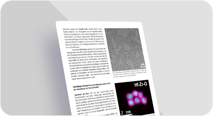 ti昀椀zieren lassen. Die Nanokristalle werden dazu in den Tumor injiziert, die Flüssigkeit mit den Nanokristallen 昀氀iesst im Lymphsystem zum ersten Lymphknoten in der Achselhöhle und dieser sogenannte Wächterlymphkno- ten wird im Röntgenbild sichtbar. Da die Lösung auch mit einem Farbsto昀昀 versehen ist, können die Chirurg:innen bei einer Operation die Wächterlymphknoten visualisie- ren und entfernen. In einem SNI-Projekt möchten wir zusammen mit Kolleg:innen vom PSI unsere Nanokristalle einsetzen, um bei Transplantations-Patient:innen Abstossungsreaktio- nen frühzeitig zu erkennen. Hierbei versehen wir die Na- nokristalle mit bestimmten Antikörpern, die spezi昀椀sch an Immunzellen binden. Wenn wir unsere Antikörper- Nanokristalle dann auf das bei einer Biopsie entnommene Gewebe eines transplantierten Organs geben, binden die Antikörper an eventuell vorhandene Immunzellen. Wir können so feststellen, ob viele Immunzellen in diesem Gewebe vorhanden sind – was ein Indiz für eine begin- Die Herstellung von Nanokristallen einheitlicher Grösse ist die Grund- nende Abstossungsreaktion wäre. voraussetzung für ihre Anwendung. (Abbildung: Departement Chemie und Nano Imaging Lab, SNI, Universität Basel) SNI INSight: Welche Herausforderungen gibt es bei der Herstellung der Nanokristalle? Jonathan de Roo: Die von uns untersuchten Oxid- Nanokristalle sind noch schwieriger herzustellen als Quantenpunkte. Zirkonium und Hafnium sind mehrfach positiv geladen und die Herstellung ihrer Oxide ist her- ausfordernd, da sie starke Bindungen besitzen, die nicht leicht aufzubrechen sind. Bindungen zu brechen ist aber eine Voraussetzung um Defekte in den Kristallen zu re- parieren. Sind sie einmal hergestellt, sind die Kristalle extrem stabil. Wir untersuchen zudem komplexe Hüllen der Kristalle – ähnlich wie die Schichten einer Zwiebel – um ihre Eigenschaften noch weiter zu optimieren. Zudem sind wir dabei Oxidcluster zu produzieren. Sie sind noch Die Gruppe von Jonathan de Roo untersucht Hafnium-Zirkonium-Oxid- kleiner als Nanokristalle und vor allem atomar sehr prä- Nanokristalle (Zirkonium-Kern und Hafnium-Hülle), um sie in der diag- zise – anders als die Nanokristalle. nostischen Bildgebung einzusetzen. (Abbildung: Departement Chemie, Es gibt auf jeden Fall genug zu tun und wir haben Universität Basel) noch viele Ideen wie wir verschiedene kolloidale Nano- kristalle für unterschiedliche Anwendungen zur Verfü- gung stellen können. SNI INSight Dezember 2023 7