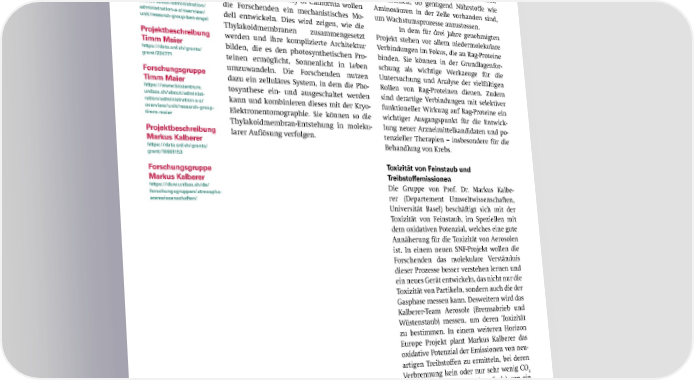 Weitere Besseres Verständnis der Photosynthese Regulierung des Zellstoffwechsels Informationen Das Team von Prof. Dr. Ben Engel (Biozent- Im Rahmen eines SNF-Projekts in Zusammen- rum, Universität Basel) untersucht Thylako- arbeit mit Forschenden der Universität Kiew Swiss National idmembranen, die bei der Photosynthese (Ukraine) untersucht Prof. Dr. Timm Maier Science Foundation eine wichtige Rolle spielen. (Biozentrum, Universität Basel) eine spezielle (SNF) In den Chloroplasten von P昀氀anzen Gruppe von Proteinen (Rag-Proteine), die eine https://www.snf.ch/de und Algen sind in diese komplexen Thylako- elementare Rolle bei der Regulierung des Projektbeschreibung idnetzwerke jene Proteinkomplexe eingebet- Zellsto昀昀wechsels spielen. Die Hauptfunktion Ben Engel tet, welche die lichtabhängigen Reaktionen der Rag-Proteine ist die Kontrolle des mTOR- https://data.snf.ch/grants/ grant/10001398 der Photosynthese steuern. In einem vom Komplexes. Rag-Proteine helfen mTOR dabei, Forschungsgruppe SNF unterstützten Projekt in Zusammenar- festzustellen, ob genügend Nährsto昀昀e wie Ben Engel beit mit der University of California wollen Aminosäuren in der Zelle vorhanden sind, https://www.biozentrum.uni- die Forschenden ein mechanistisches Mo- um Wachstumsprozesse anzustossen. bas.ch/about/administration/ administration-a-z/overview/ dell entwickeln. Dies wird zeigen, wie die In dem für drei Jahre genehmigten unit/research-group-ben-engel Thylakoidmembranen zusammengesetzt Projekt stehen vor allem niedermolekulare Projektbeschreibung werden und ihre komplizierte Architektur Verbindungen im Fokus, die an Rag-Proteine Timm Maier bilden, die es den photosynthetischen Pro- binden. Sie können in der Grundlagenfor- https://data.snf.ch/grants/ grant/224771 teinen ermöglicht, Sonnenlicht in Leben schung als wichtige Werkzeuge für die Forschungsgruppe umzuwandeln. Die Forschenden nutzen Untersuchung und Analyse der vielfältigen Timm Maier dazu ein zelluläres System, in dem die Pho- Rollen von Rag-Proteinen dienen. Zudem https://www.biozentrum. tosynthese ein- und ausgeschaltet werden sind derartige Verbindungen mit selektiver unibas.ch/about/administ- kann und kombinieren dieses mit der Kryo- funktioneller Wirkung auf Rag-Proteine ein ration/administration-a-z/ overview/unit/research-group- Elektronentomographie. Sie können so die wichtiger Ausgangspunkt für die Entwick- timm-maier Thylakoidmembran-Entstehung in moleku- lung neuer Arzneimittelkandidaten und po- Projektbeschreibung larer Au昀氀ösung verfolgen. tenzieller Therapien – insbesondere für die Markus Kalberer Behandlung von Krebs. https://data.snf.ch/grants/ grant/10001153 Forschungsgruppe Toxizität von Feinstaub und Markus Kalberer Treibstoffemissionen https://duw.unibas.ch/de/ Die Gruppe von Prof. Dr. Markus Kalbe- forschungsgruppen/atmospha- rer (Departement Umweltwissenschaften, erenwissenschaften/ Universität Basel) beschäftigt sich mit der Toxizität von Feinstaub, im Speziellen mit dem oxidativen Potenzial, welches eine gute Annäherung für die Toxizität von Aerosolen ist. In einem neuen SNF-Projekt wollen die Forschenden das molekulare Verständnis dieser Prozesse besser verstehen lernen und ein neues Gerät entwickeln, das nicht nur die Toxizität von Partikeln, sondern auch die der Gasphase messen kann. Desweitern wird das Kalberer-Team Aerosole (Bremsabrieb und Wüstenstaub) messen, um deren Toxizität zu bestimmen. In einem weiteren Horizon Europe Projekt plant Markus Kalberer das oxidative Potenzial der Emissionen von neu- artigen Treibsto昀昀en zu ermitteln, bei deren Verbrennung kein oder nur sehr wenig CO 2 entsteht (low- or zero-carbon fuels), um ein besseres Verständnis von der Toxizität dieser Treibsto昀昀e zu bekommen. Evolution von künstlichen Enzymen Die Gruppe von Prof. Dr. Thomas Ward (De- SNI-Doktorand Philippe Van der Stappen und Ben Engel partement Chemie, Universität Basel) hat in nutzen Kryo-Elektronentomographie, um die Protein- Zusammenarbeit mit der University of Cali- komplexe zu untersuchen, die an der CO -Fixierung in 2 fornia in Irvine ein Projekt zur Optimierung Algenzellen beteiligt sind. von künstlichen Katalysatoren begonnen. SNI INSight Dezember 2024 21