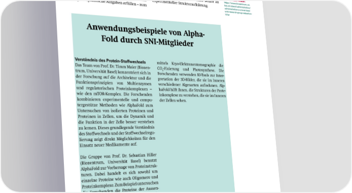 Interaktionen und verschiedenen Funktions- Beispiel der Abbau eines bestimmten Kunst- Weitere zustände von Proteinen dazu beitragen, zel- sto昀昀s. Wir haben kürzlich erstmals in einem Informationen luläres Leben zu ermöglichen – idealerweise Blockkurs mit Studierenden gezeigt, wie gut durch Betrachtung von Proteinen in ihrer dieses Proteindesign heute schon funktio- Forschungsgruppe natürlichen Umgebung in der Zelle. Vorlagen niert und wie schnell wir zu erstaunlichen Timm Maier https://www.biozentrum. für die Faltung einzelner Proteine aus einer Ergebnissen und ganz neuen Proteinen kom- unibas.ch/about/administ- KI sind dabei ein notwendiges Hilfsmittel, men. Die experimentelle Strukturaufklärung ration/administration-a-z/ overview/unit/research-group- um in einer Zelle bestimmte Proteine wie- ist dann aber gefragt, um das Proteindesign timm-maier derzuerkennen. zu optimieren und auch die Designmethoden Forschungsgruppe Gleichzeitig scha昀昀en Methoden des zu verbessern. In diesem Sinn scha昀昀t maschi- Sebastian Hiller: maschinellen Lernes auch die Möglichkeit nelles Lernen sogar zusätzlichen Bedarf an https://www.biozentrum.uni- neue Proteine am Computer zu entwerfen, experimenteller Strukturaufklärung. bas.ch/about/administration/ administration-a-z/overview/ die ganz spezi昀椀sche Aufgaben erfüllen – zum unit/research-group-sebastian- hiller Anwendungsbeispiele von Alpha- Fold durch SNI-Mitglieder Verständnis des Protein-Stoffwechsels mittels Kryo-Elektronentomographie die Das Team von Prof. Dr. Timm Maier (Biozen- CO-Fixierung und Photosynthese. Die 2 trum, Universität Basel) konzentriert sich in Forschenden verwenden KI-Tools zur Inter- der Forschung auf die Architektur und die pretation der 3D-Bilder, die sie im Inneren Funktionsprinzipien von Multienzymen verschiedener Algenarten aufnehmen. Alp- und regulatorischen Proteinkomplexen – haFold hilft ihnen, die Strukturen der Prote- wie den mTOR-Komplex. Die Forschenden inkomplexe zu verstehen, die sie im Inneren kombinieren experimentelle und compu- der Zellen sehen. tergestütze Methoden wie AlphaFold zum Untersuchen von isolierten Proteinen und Proteinen in Zellen, um die Dynamik und die Funktion in der Zelle besser verstehen zu lernen. Dieses grundlegende Verständnis des Sto昀昀wechsels und der Sto昀昀wechselregu- lierung zeigt direkt Möglichkeiten für den Einsatz neuer Medikamente auf. Die Gruppe von Prof. Dr. Sebastian Hiller (Biozentrum, Universität Basel) benutzt AlphaFold zur Vorhersage von Proteinstruk- turen. Dabei handelt es sich sowohl um einzelne Proteine wie auch Oligomere und Proteinkomplexe. Zum Beispiel untersuchen die Forschenden die Proteine der Aussen- membran von Bakterien, die durch ein Fliessband von sogenannten Chaperonen hergestellt werden. Die KI dient dabei der Bildung von Hypothesen, der Validierung von Ergebnissen und der Identi昀椀kation re- levanter Ziele – beispielsweise für die Ent- wicklung neuer Antibiotika. Interpretation von Daten Ben Engel (links) und SNI-Doktorand Philippe Van Das Team von Professor Dr. Ben Engel der Stappen (rechts) kontrollieren Algenkulturen, die leistungsfähige Mechanismen zur ef昀椀zienten CO - (Biozentrum, Universität Basel) untersucht 2 Fixierung entwickelt haben. 8 SNI INSight Dezember 2024