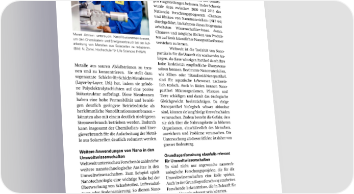 Rolle bei Nanodüngemitteln und Nanopesti- Weitere ziden und kann somit zu einer nachhaltige- Informationen ren Landwirtschaft beitragen. NFP 64 Toxizität von Nanopartikeln in der https://www.snf.ch/de/ vbdmYGLawbfYKmOY/ Umwelt seite/fokusForschung/natio- nale-forschungsprogramme/ Beim Thema Nanowissenschaften und Um- nfp64-chancen-risiken-nanoma- welt kommt zwangsläu昀椀g auch die Frage terialien nach Auswirkungen von Nanopartikeln auf die Umwelt auf. Im Netzwerk des SNI laufen zurzeit keine Projekte, die sich mit derarti- gen Fragestellungen befassen. In der Schweiz wurde dazu zwischen 2010 und 2015 das Nationale Forschungsprogramm «Chancen und Risiken von Nanomaterialien» (NFP 64) durchgeführt. Im Rahmen dieses Programms arbeiteten Wissenschaftler:innen daran, Chancen und mögliche Risiken von Produk- Meret Amrein untersucht Nano昀椀ltrationsmembranen, ten auf Basis künstlicher Nanopartikel besser um den Chemikalien- und Energieverbrauch bei der Auf- verstehen zu lernen. arbeitung von Metallen aus Solarzellen zu reduzieren. Weltweit ist die Toxizität von Nano- (Bild: N. Zonvi, Hochschule für Life Sciences FHNW) partikeln für die Umwelt ein wachsendes An- liegen, da diese winzigen Partikel durch ihre hohe Reaktivität emp昀椀ndliche Ökosysteme Metalle aus sauren Abfallströmen zu tren- stören können. Bestimmte Nanomaterialien, nen und zu konzentrieren. Sie stellt dazu wie Silber- oder Titandioxid-Nanopartikel, sogenannte Schicht-für-Schicht-Membranen sind für aquatische Lebewesen nachweis- (Layer-by-Layer, LbL) her, indem sie gelade- lich toxisch. Auch in Böden können Nano- ne Polyelektrolytschichten auf eine poröse partikel Mikroorganismen, P昀氀anzen und Stützstruktur aufbringt. Diese Membranen Tiere schädigen und damit das ökologische haben eine hohe Permeabilität und benöti- Gleichgewicht beeinträchtigen. Da einige gen deutlich geringere Betriebsdrücke als Nanopartikel biologisch schwer abbaubar herkömmliche Nano昀椀ltrationsmembranen – sind, können sie langfristige Umweltschäden könnten also mit einem deutlich niedrigeren verursachen. Zudem besteht die Gefahr, dass Stromverbrauch betrieben werden. Dadurch sie sich über die Nahrungskette in höheren kann insgesamt der Chemikalien- und Ener- Organismen, einschliesslich des Menschen, gieverbrauch für die Aufarbeitung der Metal- anreichern und Probleme verursachen. Die le aus Solarzellen deutlich reduziert werden. Untersuchung all dieser E昀昀ekte ist daher von grosser Bedeutung. Weitere Anwendungen von Nano in den Umweltwissenschaften Grundlagenforschung ebenfalls relevant Weltweit untersuchen Forschende zahlreiche für Umweltwissenschaften weitere nanotechnologische Ansätze in den Es sind nicht nur angewandte nanotech- Umweltwissenschaften. Zum Beispiel spielt nologische Forschungsprojekte, die für die Nanotechnologie eine wichtige Rolle bei der Umweltwissenschaften eine Rolle spielen. Überwachung von Schadsto昀昀en, Luftreinhal- Auch in der Grundlagenforschung erarbeiten tung oder Bodensanierung. So dienen Nano- Forschende Erkenntnisse, die in Zukunft für sensoren dazu, verschiedene Substanzen in unsere Umwelt relevant sein könnten. Luft, Wasser und Boden genau zu überwa- Zum Beispiel untersucht das Team chen. Nanokatalysatoren und Photokatalyse von Prof. Dr. Ernst Meyer (Departement Phy- werden eingesetzt, um Luftschadsto昀昀e wie sik, Universität Basel) die Grundlagen von Stickoxide abzubauen. Bei Bodensanierun- Reibung auf der Nanometerskala. Wenn wir gen unterstützen Eisen-Nanopartikel den mithilfe dieser Forschung Reibung verrin- Abbau organischer Schadsto昀昀e im Boden gern könnten, liesse sich die Energiee昀케zienz und Grundwasser. Zudem lassen sich mit steigern. nanotechnologischen Methoden Mikroor- Von entscheidender Bedeutung ganismen fördern, die Umweltschadsto昀昀e für unsere Zukunft ist auch das detaillierte abbauen. Nanotechnologie spielt auch eine Verständnis der Photosynthese und der Or- 14 SNI INSight Dezember 2024