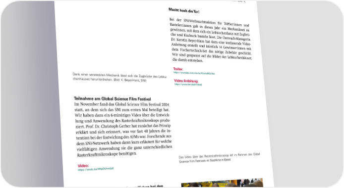 Austausch auf dem Rüeblimärt Mit ganz unterschiedlichen Altersgruppen – vom Klein- kind bis zu den Grosseltern – kommt das SNI-Team am jährlich in Aarau statt昀椀ndenden Rüeblimärt in Kontakt. Am SNI-Stand konnten dieses Jahr Klein und Gross An- hänger mit UV-Warnperlen basteln und dabei noch etwas über Licht und das SNI erfahren. Impressionen: Der Rüeblimärt bietet eine gute Gelegenheit über «Nano» zu informie- https://www.youtube.com/shorts/RiD_1zbz4_0 ren und unterhaltsame und lehrreiche Aktivitäten anzubieten. (Bild. K. Beyer-Hans, SNI) Macht hoch die Tür! Bei der SNI-Weihnachtsaktion für Tüftler:innen und Basteler:innen gab es dieses Jahr ein Mechanikset zu gewinnen, mit dem sich ein Lebkuchenhaus mit Zugbrü- cke und Kuckuck basteln lässt. Die Outreach-Managerin Dr. Kerstin Beyer-Hans hat dazu eine umfassende Video- Anleitung erstellt und kürzlich 14 Gewinner:innen mit dem Fischertechnik-Set das nötige Zubehör geschickt. Wir sind gespannt auf die Bilder der Lebkuchenhäuser, die damit entstehen. Trailer: https://youtube.com/shorts/XUvkyMQ1NxI Dank einer versteckten Mechanik lässt sich die Zugbrücke des Lebku- chenhauses herunterdrehen. (Bild: K. Beyer-Hans, SNI) Video-Anleitung: https://youtu.be/yfe2IT79ztE Teilnahme am Global Science Film Festival Im November fand das Global Science Film Festival 2024 statt, an dem sich das SNI zum ersten Mal beteiligt hat. Wir haben dazu ein 6-minütiges Video über die Entwick- lung und Anwendung des Rasterkraftmikroskops produ- ziert. Prof. Dr. Christoph Gerber hat zunächst das Prinzip erklärt und sich erinnert, was vor fast 40 Jahren die In- tention bei der Entwiclung des AFMs war. Forschende aus dem SNI-Netzwerk haben dann kurz erläutert für welche vielfältigen Anwendung sie die ganz unterschiedlichen Rasterkraftmikroskope benötigen. Das Video über das Rasterkraftmikroskop lief im Rahmen des Global Video: Science Film Festivals im Stadtkino in Basel. https://youtu.be/WtpDUhmIjsE Kontakt mit zahlreichen Jugendlichen bei den Science Days im Europa-Park Rust Ein Highlight für das SNI-Outreach-Team ist jedes Jahr die Teilnahme an den Science Days im Europa Park Rust (Deutschland). Hier hat des SNI Outreach-Team die Gele- genheit mit tatkräftiger Unterstützung durch Nano-Stu- dierende zahlreiche Jugendliche mit Experimenten und Aktivitäten für Naturwissenschaften zu interessieren. Diese Jahr war das Thema «Du und deine DNA». Impressionen: Bei den Science Days drehte sich am SNI-Stand alles um DNA. (Bild: K. https://youtube.com/shorts/Jx_y-pC6TK0 Beyer-Hans, SNI) SNI INSight Dezember 2024 30