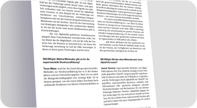 Zuverlässigkeit der Vorhersage einzuordnen. liefern. Wir können beispielsweise mit der Swiss Light Es sind vor allem zwei Gründe, die dahingehend für Un- Source am Paul Scherrer Institut innerhalb einer Woche terschiede sorgen. Zum einen sind Proteine sehr 昀氀exibel rund Hundert Proteine analysieren – vorausgesetzt wir und dynamisch. Die statische Struktur, die wir norma- haben Kristalle zur Hand. Zudem eignet sich die Röntgen- lerweise betrachten, spiegelt also nur einen Zeitpunkt kristallographie bestens für spannende Spezialanwen- oder eine mögliche Konformation des Proteins wider. dungen wie die Untersuchung von Metallionen. Mit dem Einige Regionen von Proteinen be昀椀nden sich in ständi- freien Röntgenlaser SwissFEL lassen sich beispielsweise ger Bewegung, die als intrinsisch ungeordnet bezeichnet auch dynamische Prozesse wie die Bindung von Molekü- werden. Jeder Versuch, diesen Regionen einen festen Satz len in Echtzeit verfolgen. von 3D-Koordinaten zuzuordnen, ist nicht sinnvoll oder Für grössere Proteine eignet sich die Kryo-Elek- interpretierbar. tronenmikroskopie (Kryo-EM), mit der wir inzwischen Zum anderen gibt es etliche Proteine, für die es auch sehr grosse Proteinkomplexe abbilden können und nur wenige koevolutionäre Signale gibt. Da sich Alpha- damit genaue Information über die Struktur erhalten. Fold bei der Vorhersage jedoch darauf stützt, sind gute Kryo-EM ist allerdings bei weitem nicht so schnell wie die Vorhersagen nicht möglich, wenn diese Signale nur spär- Röntgenkristallographie. Zudem generieren wir unglaub- lich vorhanden sind. Aus diesem Grund hat AlphaFold lich grosse Datenmengen, die wir für lange Zeit speichern seine Grenzen, so zum Beispiel bei der Vorhersage von müssen – was einen enormen Kostenfaktor darstellt. Strukturen von Viren-Proteinen, Antikörper-Antigen- Wir setzen auch NMR (Nuklearmagnetische Reso- komplexen oder bei der Untersuchung des Ein昀氀usses von nanz) zur Strukturaufklärung ein – vor allem für kleine Mutationen auf die Struktur. Auch für die Untersuchung Proteine in Lösung und zur Untersuchung von Interakti- von Bindungen biologischer oder synthetischer Molekü- onen und ihrer Dynamik in der Zelle. NMR ist allerdings le wie bei der Suche nach neuen Medikamenten gibt es schwierig und zeitaufwändig bei grossen Proteinen und Einschränkungen. erfordert Isotopenmarkierung. Für das schnelle «Testen» Die von AlphaFold gelieferten Kon昀椀denzwerte von Faltungen oder dem spezi昀椀schen Auslesen bestimm- spiegeln diese Unsicherheiten normalerweise wider. Für ter Eigenschaften ist NMR jedoch sehr e昀昀ektiv. uns bietet das die Möglichkeit, sich auf die Teile der Pro- Jede dieser Methoden hat ihre spezi昀椀schen Vor- teine bzw. die Proteine zu konzentrieren, bei denen die und Nachteile, und die Wahl der Methode hängt von der Vorhersage zuverlässig ist und die Fälle anzuzeigen, in Art des Proteins, der Verfügbarkeit von Ressourcen und denen es keine guten Vorhersagen machen kann. dem gewünschten Detailgrad der Struktur ab. SNI INSight: Welche Methoden gibt es für die SNI INSight: Werden diese Methoden jetzt durch experimentelle Strukturaufklärung? AlphaFold ersetzt? Timm Maier: Auch bei der Entwicklung experimenteller Janani Durairaj: Experimentelle Methoden und Alpha- Methoden zur Strukturaufklärung hat es in den letzten Fold ergänzen sich. Eine nützliche Analogie ist hier Wiki- Jahren enorme Fortschritte gegeben. Nach wie vor spielt pedia gegenüber ChatGPT. Sorgsam geprüfte experimen- die Röntgenkristallographie eine wichtige Rolle. Sie ist telle Strukturen sind dabei mit Wikipedia zu vergleichen bestens geeignet, um mit einem hohen Durchsatz hoch- und die Vorhersagen durch AlphaFold mit ChatGPT. Die au昀氀ösende Strukturen von kleinen Proteinmolekülen zu geprüften, experimentellen Strukturen enthalten viele Informationen über spezi昀椀sche biologisch relevante Wechselwirkungen und Mechanismen für eine kleinere Teilmenge bekannter Proteine. AlphaFold2 dagegen lie- fert Vorhersagen für eine weit grössere Anzahl von Prote- inen, für die es bisher keine experimentelle Struktur gibt und liefert damit sehr gute Ausgangspunkte für weitere Untersuchungen. Timm Maier: Ganz im Gegenteil, AlphaFold und ver- wandte Methoden sind ein wichtiger Beitrag zur notwen- digen Weiterentwicklung der experimentellen Analyse. Vor 20–30 Jahren lag der Fokus der experimentellen Strukturbestimmung bei der Aufklärung neuer prinzi- pieller Proteinfaltungen. Man wollte damit Daten aus der Genomforschung nutzen, um den Faltungsraum von Timm Maier und sein Team kombinieren experimentelle und compu- Proteinen zu erkunden. Dieser Prozess ist seit langem tergestütze Methoden wie AlphaFold zum Untersuchen von isolierten abgeschlossen. Heute beschäftigt sich die experimentel- Proteinen und Proteinen in Zellen, um die Dynamik und die Funktion in le Strukturbiologie mit der Frage wie die dynamischen der Zelle besser verstehen zu lernen. SNI INSight Dezember 2024 7