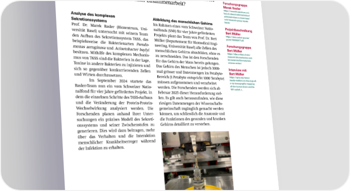 Fördermittel für SNI-Mitglieder Weitere Informationen In den letzten Monaten haben zahlreiche SNI-Mitglieder Zuspra- Swiss National chen für Forschungsprojekte aus ganz unterschiedlichen Quellen Science Foundation (SNF) bekommen. Wir beschreiben die verschiedenen Forschungspro- https://www.snf.ch/de jekte hier kurz, um damit einen Einblick in die Vielfalt der bear- Projektbeschreibung Marek Basler beiteten wissenschaftlichen Fragestellungen innerhalb unseres https://data.snf.ch/grants/ grant/10000935 Netzwerks zu geben. Vielleicht inspiriert ja das ein oder andere Forschungsgruppe Thema zu einer Zusammenarbeit? Marek Basler https://www.biozentrum.uni- bas.ch/about/administration/ administration-a-z/overview/ unit/research-group-marek- Analyse des komplexen Abbildung des menschlichen Gehirns basler Sekretionssystems Im Rahmen eines vom Schweizer Natio- Projektbeschreibung Prof. Dr. Marek Basler (Biozentrum, Uni- nalfonds (SNF) für vier Jahre geförderten Bert Müller https://data.snf.ch/grants/ versität Basel) untersucht mit seinem Team Projekts plant das Team von Prof. Dr. Bert grant/10000247%20 den Aufbau des Sekretionssystem T6SS, das Müller (Departement für Biomedical Engi- Forschungsgruppe beispielsweise die Bakterienarten Pseudo- neering, Universität Basel) alle Zellen des Bert Müller monas aeruginosa und Acinetobacter baylyi menschlichen Gehirns abzubilden, ohne es https://dbe.unibas.ch/en/ besitzen. Mithilfe des komplexen Mechanis- zu zerschneiden. Das ist den Forschenden research/biomechanics-and- biomaterials/biomaterials- mus von T6SS sind die Bakterien in der Lage, für das Gehirn der Maus bereits gelungen. science-center/ Toxine in andere Bakterien zu injizieren und Das Gehirn des Menschen ist jedoch 3000- Interview mit sich so gegenüber konkurrierenden Zellen mal grösser und Datenmengen im Petabyte- Bert Müller und Wirten durchzusetzen. Bereich (1 Petabyte entspricht 1000 Terabyte) https://spie.org/news/ heady-matters-on-the-cusp-of- Im September 2024 startete das müssen aufgenommen und verarbeitet x-ray-tomographic-mapping- Basler-Team nun ein vom Schweizer Natio- werden. Die Forschenden werden sich ab of-the-human-brain-and-its- 1011-cells#_=_ nalfond für vier Jahre gefördertes Projekt, in Februar 2025 dieser Herausforderung stel- dem die einzelnen Schritte des T6SS-Aufbaus len. Es gilt auch herauszu昀椀nden, wie diese und die Veränderung der Protein-Protein- riesigen Datenmengen der Wissenschafts- Wechselwirkung analysiert werden. Die gemeinschaft zugänglich gemacht werden Forschenden planen anhand ihrer Unter- können, um schliesslich die Anatomie und suchungen ein präzises Modell des Sekreti- die Funktionen des gesunden und kranken onssystems und seiner Zwischenstufen zu Gehirns detailliert zu verstehen. generieren. Dies wird dazu beitragen, mehr über das Verhalten und die Interaktion menschlicher Krankheitserreger während der Infektion zu erhalten. Das Team von Marek Basler untersucht den komplexen Mechanismus des Sekretionssystems T6SS, mit dem Bakterien in der Lage sind, Toxine in andere Bakterien zu Forschende um Bert Müller haben bereits die Zellen des injizieren und sich so gegenüber konkurrierenden Zellen Mausgehirns abgebildet ohne Schnitte vorzunehmen. und Wirten durchzusetzen. (Video: Biozentrum, Univer- Nun planen sie die 86 Milliarden Zellen des menschlichen sität Basel) Gehirns darzustellen. (Bild: Departement für Biomedical Engineering, Universität Basel) 20 SNI INSight Dezember 2024