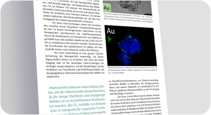 miert werden können, um die E昀케zienz der elektrochemi- schen Reaktionen zu verbessern. Dabei lag der Fokus auf der Verwendung umweltfreundlicher und nachhaltiger Materialien. Katalyse mit Nanopartikeln Um das Problem des Klimawandels zu lösen, reichen er- neuerbare Energien und bessere Energiespeicher nicht aus. Weltweit gibt es verschiedene Ansätze, um CO und 2 andere Treibhausgase aus der Atmosphäre zu entfernen. Die Gruppe von Prof. Dr. Markus Kalberer (De- partement Umweltwissenschaften, Universität Basel) beispielweise untersucht, ob sich Nanopartikel eignen, um – durch Licht angeregt – als Katalysatoren den Abbau von CO zu fördern. Der Einsatz von Nanopartikeln ist 2 besonders vielversprechend, da sie eine sehr grosse Ober- Transmissionselektronenmikroskopische Aufnahme von Titandioxid 昀氀äche im Verhältnis zum Volumen besitzen. Sie weisen (helle grosse Punkte) und Gold-Nanopartikeln (kleine, dunklere Punkte). zudem zahlreiche Ober昀氀ächendefekte auf, die den Wir- (Bild: B. Gfeller, Departement Umweltwissenschaften, Universität Basel) kungsgrad der Umsetzung zusätzlich verbessern. Für diese Untersuchungen stellen die Forschen- den zunächst durch Versprühen Titandioxid-Nanoparti- kel her. In einem Funkengenerator überziehen sie die Nanopartikel anschliessend mit Gold-Nanopartikeln. Durch die Kombination von Titandioxid- und Gold-Nano- partikeln kann das nutzbare Spektrum des Lichts von UV bis zu sichtbarem Licht erweitert werden. Damit können die Forschenden den katalytischen CO -Abbau mit Son- 2 nenlicht starten und verbessern zudem die E昀케zienz. Vor einer Anwendung ist eine genaue Charak- terisierung der Nanopartikel notwendig, um deren Eigenschaften besser zu verstehen. Das Team des Nano Imaging Labs ist bei derartigen Untersuchungen ein wichtiger Ansprechpartner, um die Morphologie und das X-Ray Spektroskopie. In blau die Titandioxid-Nanopartikel und in grün die Verhältnis von Titandioxid- und Gold-Nanopartikeln mit Gold-Nanopartikel (Bild: B. Gfeller, Departement Umweltwissenschaf- hochaufgelösten elektronenmikroskopischen Bildern zu ten, Universität Basel) analysieren. an Nano昀椀ltrationsmembranen zur Wiederverwendung «Nanopartikel könnten einen Beitrag leis- wertvoller Metalle in Solarzellen. Die Rückgewinnung dieser und anderer Rohsto昀昀e ist entscheidend für den ten, um den Klimawandel abzuschwächen, Weg zur geplanten Klimaneutralität, um die Versorgung da die riesige Ober昀氀äche und einzigartige und Nachfrage zu decken. Defekte sie zu hoche昀케zienten Katalysato- Das Team, in dem Meret Amrein arbeitet, konzen- triert sich auf das Recycling von Dünnschicht-Solarzellen ren machen, die CO mithilfe von Sonnen- der neuen Generation, deren Produktion in den kommen- 2 licht in energiereiche organische Verbin- den Jahren stark zunehmen wird. Die Dünnschicht-Solar- dungen wie Methan (Erdgas) umwandeln zellen enthalten oft Metalle wie Silber und Indium. Bei der können.» Wiederaufbereitung werden Metalle üblicherweise durch Hydrometallurgie (Extraktion mit wässrigen Lösungen) getrennt und gereinigt. Der Chemikalienverbrauch bei Benjamin Gfeller, PhD Student Kalberer Group, dieser Aufarbeitung ist oft sehr hoch und mit negativen Departement Umweltwissenschaften, Umweltauswirkungen und Gesundheitsrisiken verbun- Universität Basel den. Hier kann die chemikalienfreie Nano昀椀ltration – ein druckgetriebenes Verfahren zur Behandlung wässriger Lösungen mit Porengrössen unter zwei Nanometern – (Rück)Gewinnung von Rohstoffen eine vielversprechende Alternative oder Ergänzung zur Am Institut für Ecopreneurship an der Hochschule für klassischen Hydrometallurgie bieten. Life Sciences FHNW forscht die ehemalige Nanostuden- Meret Amrein untersucht in ihrer Doktorarbeit tin Meret Amrein unter Leitung von Dr. Markus Lenz massgeschneiderte Nano昀椀ltrationsmembranen, um SNI INSight Dezember 2024 13