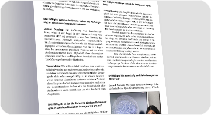 SNI INSight: Ist Alphafold frei zugänglich? zierungsprojekten zwar Millionen von Proteinsequenzen von den unterschiedlichsten Organismen gibt, aber nur Timm Maier: Der Quellcode für die neuesten AlphaFold- Hunderttausende von experimentell ermittelten Prote- Versionen wurde erst mit einer Verzögerung nach der instrukturen, da jede Struktur Jahre komplexer Studien wissenschaftlichen Publikation freigegeben, ist aber benötigen kann, um gelöst zu werden. letztendlich seit November verfügbar. Wie auch bei AlphaFold lernt aus diesen Strukturen und Se- vielen anderen KI-Produkten basiert AlphaFold auf frei quenzen, um nun hochpräzise Vorhersagen für viele verfügbaren Daten, die grösstenteils durch akademische Millionen von Sequenzen zu ermöglichen, was uns der Institutionen generiert wurden. Die Nutzung der trai- Schliessung dieser Lücke sehr viel näher bringt. nierten Modelle ist im Gegensatz zu den zum Training verwendeten Daten nun auf nicht-kommerzielle Anwen- dungen limitiert, was die Gefahr einer Monopolisierung SNI INSight: Wie lange dauert die Analyse mit Alpha- neuer Methoden mit sich bringt. Allerdings ist die wissen- Fold? schaftliche Gemeinschaft schon in zahlreichen Projekten daran, gleichwertige Methoden auch frei zur Verfügung Janani Durairaj: Das DeepMind-Team hat in Zusammen- zu stellen. arbeit mit dem European Bioinformatics Institute des European Molecular Biology Laboratory (EMBL-EBI) die AlphaFold-Datenbank eingerichtet, in der Vorhersagen SNI INSight: Welche Au昀氀ösung haben die vorherge- für mehr als 200 Millionen Proteinsequenzen enthalten sagten dreidimensionalen Strukturen? sind. Innerhalb von Sekunden erhält man bei Nennung des Proteinnamens die Strukturvorhersage. Janani Durairaj: Die Au昀氀ösung von Proteinstruk- Die Zeit für eine Strukturvorhersage für eine be- turen wird in der Regel in der Grössenordnung von stimmte Sequenz, die nicht in der Datenbank enthalten -10 Angström (10 m) gemessen – was dem Bereich der ist, hängt von der Länge des Proteins und den zur Verfü- interatomaren Abstände entspricht. Experimentelle gung stehenden Rechenressourcen ab. Sie liegt zwischen Strukturbestimmungsmethoden wie die Röntgenkristal- Minuten und Stunden – was sich deutlich unterschiedet lographie erreichen Genauigkeiten von bis zu 1 Angst- von den Monaten und Jahren, die für die experimentelle röm. Bei monomeren Proteinen (Proteine mit nur einer Strukturaufklärung benötigt werden. Aminosäurenkette) kann AlphaFold diese Genauigkeit Eine sehr nützliche Community-Ressource ist Co- ebenfalls erreichen und liegt damit innerhalb des Fehler- labFold, eine interaktive webbasierte Plattform, auf der bereichs experimenteller Methoden. man eine Proteinsequenz eingibt und eine von AlphaFold vorhergesagte Struktur erhält, ohne dass ein Installati- Timm Maier: Wir sollten dabei beachten, dass ein Gross- onsprozess oder Rechenressourcen erforderlich sind. teil der Proteine aus mehreren Aminosäureketten besteht und dass in vielen Fällen eine «durchschnittliche» Genau- igkeit nicht sehr aussagekräftig ist. So können beispiels- SNI INSight: Wie zuverlässig sind die Vorhersagen von weise einzelne Mutationen in einem reaktiven Zentrum AlphaFold? eines Enzyms die Substratspezi昀椀tät komplett verändern, die Gesamtstruktur ändert sich im Durchschnitt aller Janani Durairaj: Mit jeder Strukturvorhersage liefert Aminosäuren dann jedoch nur um den Bruchteil eines AlphaFold eine Qualitätseinschätzung, die uns hilft die Angströms. SNI INSight: Es ist die Rede von riesigen Datenmen- gen, in welchen Bereichen bewegen wir uns da? Janani Durairaj: Wenn wir an alle möglichen 3D-Kon- formationen denken, die ein Protein annehmen kann, sprechen wir von einer astronomischen Anzahl mög- licher Konformationen. So könnte beispielsweise ein Protein mit 100 Aminosäuren theoretisch zu mehr als 198 3 verschiedenen Konformationen führen, selbst wenn man konservativ schätzt. Dies schliesst die Aufzählung dieser Konformationen als algorithmische Lösung für die Vorhersage von Proteinstrukturen sofort aus. Aus einem anderen Blickwinkel betrachtet, gibt Janani Durairaj, die als Ambizione-Stipendiatin ihre eigene Forschungs- es die sogenannte «Sequenz-Struktur»-Lücke. Diese be- gruppe aufbaut, hat intensiv an der Erstellung des «Protein Universe At- sagt, dass es aufgrund von weltweit laufenden Sequen- las» mitgearbeitet. Dies ist ein Webdienst, mit dem Nutzer:innen durch ein Universum aus Millionen bekannter Proteine navigieren können. SNI INSight Dezember 2024 6
