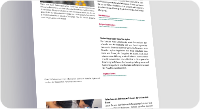 2D-Schicht aus Phosphor-Pentameren: Auch auf Metall mit Halbleitereigenschaften Phosphor ist ein spannendes Element, das sowohl über- lebenswichtig für Organismen ist wie auch zahlreiche elektronische Anwendungen verspricht. Daher haben For- schende der Universität Basel auf einer Silberober昀氀äche Fünferringe von Phosphoratomen (Phosphor-Pentamere (Cyclo-P5)) synthetisiert und ihre elektronischen Eigen- schaften erstmals mithilfe kombinierter Rasterkraft- und Rastertunnelspektroskopie untersucht. Sie stellten dabei fest, dass die atomare Phosphor-Pentamerschicht ihre Halbleitereigenschaften beibehält und sich an der Grenz- 昀氀äche zur Silberober昀氀äche eine spezielle elektronische Schnittstelle ausbildet (p-Typ-Halbleiter-Metall-Schottky- Wenn sich durch Selbstorganisation Fünferringe von Phosphoratomen Übergang). (Phosphor-Pentamere) auf einer Silberober昀氀äche bilden, behält die zwei- dimensionale Phosphorschicht ihre Halbleitereigenschaften bei. An der SNI-Meldung: Grenz昀氀äche zur Silberober昀氀äche bildet sich eine spezielle Schnittstelle https://nanoscience.unibas.ch/de/news/details/2d-schicht-aus-phosphor-pentameren- (p-Typ-Halbleiter-Metall-Schottky-Übergang). (Bild: R. Pawlak, Departe- auch-auf-metall-mit-halbleitereigenschaften/ ment Physik, Universität Basel) Originalpublikation: https://www.nature.com/articles/s41467-024-50862-4 Volles Haus beim NanoTec Apéro Die interne Nano-Community sowie interessierte For- schende aus der Industrie und von Forschungsinstitu- tionen der Nordwestschweiz waren im November zum NanoTec Apéro eingeladen. Das Team vom Park Inno- vaare war dieses Jahr Gastgeber des Events. Nach einer interessanten Führung am Paul Scherrer Institut erhiel- ten alle Anwesenden einen Einblick in die angewandte Forschung im Rahmen des Nano-Argovia-Programms und hatten Gelegenheit, neue Kontakte zu knüpfen und Ideen für Projekte auszutauschen. Impresssionen: https://youtube.com/shorts/tDm5riP0UFo Über 70 Teilnehmer:innen informierten sich beim NanoTec Apéro und nutzten die Gelegenheit Kontakte auszubauen. Teilnahme an Schnupper Schools der Universität Basel Auch die von der Universität Basel ausgerichteten Sum- mer und Winter Schnupper Schools sprechen Jugendli- che an. Das SNI-Team beteiligte sich daran und gibt den interessierten Schüler:innen einen Einblick in die Nano- wissenschaften und informiert über den interdisziplinä- ren Studiengang Nanowissenschaften. Zudem können die Teilnehmer:innen anhand einiger Experimente auch erleben, wo «Nano» eine Rolle spielt. Bei der Summer und Winter Schnupper School gibt es so einiges aus- Impressionen: https://www.youtube.com/shorts/Jx_y-pC6TK0 zuprobieren. SNI INSight Dezember 2024 29