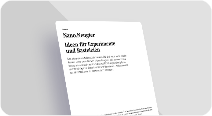 Während der Corona-Pandemie hat das damalige SNI-Outreach-Team mit Dr. Kerstin Beyer-Hans, Dr. Michèle Wegmann und Dr. Christel Möller begon- nen, kurze Videos über Experimente für zuhause zu produzieren – mit dem Ziel unterschiedliche natur- wissenschaftliche Phänomene auf unterhaltsame, anschauliche Weise zu präsentieren und zu erklären. Mit «Nano.Neugier» bekommen diese Aktivitäten jetzt ihre eigenen Kanäle auf Instagram, TikTok und YouTube. Sie werden mit zahlreichen Anleitungen für Basteleien ergänzt, die im Alltag Freude bereiten oder sich als Geschenk eignen. Neu waren in den letzten Wochen beispielsweise zahlreiche zur Jah- reszeit passende Origami-Projekte. Regelmässig pos- tet die Outreach Managerin Kerstin Beyer-Hans aber auch die verschiedenen kleinen Experimente, die sich mit Haushaltsmaterialien zuhause durchführen lassen und auf spannende Art und Weise grundle- gende naturwissenschaftliche Gesetze zeigen. «Wir möchten mit den Nano.Neugier-Kanälen eine Quelle für unterhaltsame Beschäftigungen für Familien bie- ten», erläutert sie. Aus eigener Erfahrung weiss Kers- Weitere Informationen: Nano.Neugier Instagram Nano.Neugier YouTube Nano.Neugier TikTok Weitere Social Media- Kanäle des SNI: LinkedIn YouTube Bluesky Instagram Outreach Nano.Neugier Ideen für Experimente und Basteleien Seit etwa einem halben Jahr hat das SNI drei neue social Media- Kanäle: Unter dem Namen «Nano.Neugier» gibt es sowohl auf Instagram wie auch auf YouTube und TikTok regelmässig Tipps und Vorschläge für Experimente und Basteleien – meist passend zur Jahreszeit oder zu bestimmten Feiertagen. tin Beyer-Hans, dass derartige Aktivitäten beispiels- weise an einem verregneten Wochenende die Stim- mung zuhause retten können. Ergänzung existierender Kanäle Mit dem Zielpublikum Familien grenzt sich «Nano. Neugier» damit von den existierenden SNI-Kanälen ab. An aktuelle und zukünftige Studierende richtet sich der Instagram-Kanal «nano_study_sni». Der You- Tube-Kanal «Swiss Nanoscience Institute» hält Videos über Nanoforschung am SNI, über das Nanostudium, Veranstaltungen und die PhD School bereit. Über LinkedIn und über den relativ neuen Bluesky-Kanal des SNI informieren wir regelmässig über Neuigkei- ten aus unserem Netzwerk. Auf allen Kanälen freuen wir uns über zahlreiche neue Follower, Kommentare und Anregungen. 30 SNI INSight Dezember 2025