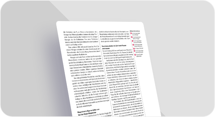 Weitere Informationen: Forschungsgruppe Oliver Wenger Forschungsgruppe Martino Poggio Forschungsgruppe Tomasz Smoleński Forschungsgruppe Richard Warburton Uni News PHOQUS Forschungsgruppe Dominik Zumbühl Interreg Projekt UpQuantVal endlich wollen die Forschenden das Verständnis von Magnetismus verbessern und untersuchen, wie Van- der-Waals-Materialien für zukünftige Anwendungen in ultrakleinen magnetischen Bauteilen oder Spei- chern genutzt werden könnten. Quantenzustände mit Licht beeinflussen und steuern Der seit Anfang 2025 neu am Departement Physik der Universität Basel tätige Prof. Dr. Tomasz Smoleński hat in den letzten Monaten sowohl einen ERC Starting Grant wie auch ein SNF-Spark-Projekt bekommen. Im Rahmen des ERC Starting Grant, der für fünf Jahre finanziert ist und im Januar 2026 beginnen soll, werden Forschende aus der Smoleński-Gruppe untersuchen, wie Licht die Eigenschaften neuartiger Quantenmaterialien selektiv verändern kann. Die untersuchten Van-der-Waals-Heterostrukturen be- stehen aus nur wenigen Atomschichten und beher- bergen kollektive elektronische Zustände, die sich so verhalten, als wären sie einem extrem starken künstlichen Magnetfeld ausgesetzt – obwohl kein reales Magnetfeld angelegt wird. Das Projekt zielt darauf ab, zu verstehen, wie Licht diese empfindli- chen Quantenzustände beeinflussen und steuern kann. Langfristig sollen diese Erkenntnisse neue Wege für die optische Steuerung von Quantenpha- sen eröffnen – ein wichtiger Schritt in Richtung zu- künftiger Quanten- und Nanotechnologien. Im Rahmen des SNF-Spark-Projekts wird das Team von Smoleński eine neuartige quantenoptische Schnittstelle implementieren, um die Dynamik von Elektronen zu erfassen, die in zweidimensionalen Materialien exotische Zustände bilden. Dieser Ansatz könnte eine revolutionäre photonische Plattform bieten, die einen ultraschnellen Zugang zu neu ent- stehenden Quantenphasen der Materie ermöglicht. Verschränkte Photonen für Quantentechnologie Ein internationales Team mit Beteiligung von Prof. Dr. Richard Warburton vom Departement Physik der Universität Basel hat kürzlich einen der begehrten ERC Synergy Grants zugesprochen bekommen. In diesem Projekt wollen die Forschenden verschränkte Photonen für Anwendungen in der Quanteninfor- matik und Quantenkommunikation erzeugen. Die verschränkten Photonen sollen mithilfe modernster Halbleitertechnologie erzeugt werden. Bislang konnten in der Quantenkommunikation nur einzelne Photonen zur Übertragung von Infor- mationen über grosse Entfernungen oder als kleinste Einheit eines Quantencomputers (Qubit) verwendet werden. Je mehr Photonen verwendet werden, desto komplizierter und teurer wird die Hardware. Im Rahmen des PHOQUS-Projekts, das nun für sechs Jahre als Teil des EU-Programms «Horizon Eu- rope» bewilligt wurde, wollen die Forschenden soge- nannte «Ressourcenzustände» (photonic resource Magnetische Eigenschaften von Van-der-Waals-Materialien Im April 2026 wird Professor Dr. Martino Poggio (De- partement Physik, Universität Basel) ein vierjähriges SNF-Projekt starten. Im Rahmen dieser Arbeit wird sein Team extrem dünne magnetische Materialien untersuchen – sogenannte Van-der-Waals-Magnete, die aus nur einer oder wenigen Atomschichten be- stehen. Das Ziel ist zu verstehen, wie sich die mag- netischen Eigenschaften verändern, wenn ein Mate- rial so dünn wird. Obwohl Magnetismus in makroskopischen Sys- temen gut verstanden ist, stellen der sogenannte «niedrigdimensionale» Magnetismus und die Mecha- nismen, die ihn stabilisieren, weiterhin eine Heraus- forderung dar. Zudem sind die Forschenden ge- spannt darauf zu untersuchen, wie diese Materialien zu magnetischen Bauelementen mit neuen Funkti- onen verarbeitet werden können. Um diese Systeme zu erforschen, muss das Team extrem empfindliche magnetische Bildgebungsver- fahren entwickeln, mit denen sich die winzigen Ma- gnetfelder einzelner Atomschichten auflösen lassen. Dazu gehören Rastersonden auf Basis von Nanoma- gnetometern oder hochempfindlichen mechani- schen Oszillatoren, die Magnetfelder im Bereich von nur wenigen Nanometern abbilden können. Letzt- die Oxidation von N2 zu Nitrat zu katalysieren. Als Dünger hat Nitrat gegenüber Ammoniak einige Vor- teile. Zudem benötigt die Oxidation von N2 weniger Energie als die Reduktion. Das neue Verfahren könnte somit den Energieverbrauch in der Landwirt- schaft nachhaltig senken. Den anderen ERC Advanced Grant hat Prof. Dr. Oliver Wenger erhalten für seine Forschung in der Photochemie – der Untersuchung chemischer, durch Licht ausgelöster Reaktionen. Wenger und sein Team wollen das Potenzial der Photochemie erweitern, indem sie eine grundle- gende Einschränkung überwinden: Nach der soge- nannten Kasha-Regel kann nur der niedrigste ange- regte Zustand eines Moleküls für chemische Reakti- onen genutzt werden. Höher angeregte Zustände verlieren ihre Energie zu schnell, sodass sie bislang nicht effektiv einsetzbar sind. Das nun geförderte Projekt hat zum Ziel, diese Grenzen zu überwinden und chemische Reaktionen gezielt aus höher angeregten Zuständen heraus zu starten. Dazu verfolgen die Forschenden zwei An- sätze: Sie wollen den Energieverlust dieser Zustände verlangsamen und gleichzeitig die Reaktionsge- schwindigkeit erhöhen, sodass die Reaktionen schneller ablaufen, als die Energie verloren geht. Gelingt es, diese Reaktionen zuverlässig zu realisie- ren, könnte dies sowohl die synthetische Chemie als auch die effiziente Umwandlung von Sonnenenergie deutlich voranbringen. 16 SNI INSight Dezember 2025