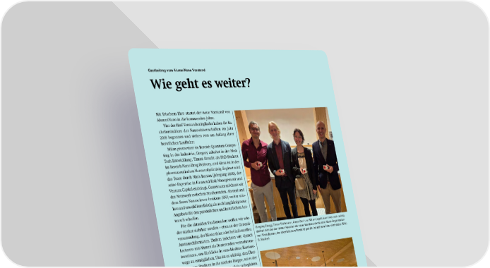 Gastbeitrag vom AlumniNano Vorstand Wie geht es weiter? Mit frischem Elan startet der neue Vorstand von AlumniNano in die kommenden Jahre. Vier der fünf Vorstandsmitglieder haben ihr Ba- chelorstudium der Nanowissenschaften im Jahr 2018 begonnen und stehen nun am Anfang ihrer beruflichen Laufbahn: Milan promoviert im Bereich Quantum Compu- ting in der Industrie, Gregory arbeitet in der Med- Tech-Entwicklung, Timon forscht als PhD-Student im Bereich Nano Drug Delivery, und Alexa ist in der pharmazeutischen Nanoanalytik tätig. Ergänzt wird das Team durch Niels Burzan (Jahrgang 2010), der seine Expertise in Financial Risk Management und Venture Capital einbringt. Gemeinsam möchten wir das Netzwerk zwischen Studierenden, Alumni und dem Swiss Nanoscience Institute (SNI) weiter stär- ken und sowohl kurzfristig als auch langfristig neue Angebote für den persönlichen und beruflichen Aus- tausch schaffen. Für die aktuellen Studierenden wollen wir wie- der stärker sichtbar werden – etwa an der General- versammlung, der Masterfeier oder bei informellen Austauschformaten. Zudem möchten wir «Lunch Lectures» mit Alumni als Dozierenden vermehrt un- terstützen, um Einblicke in verschiedene Karriere- wege zu ermöglichen. Uns ist es wichtig, den Über- gang vom Studium in die nächste Etappe, sei es der Berufseinstieg oder ein Doktorat, aktiv zu begleiten. Langfristig möchten wir dafür ein Mentoring-Pro- gramm zwischen Studierenden und engagierten Alumni aufbauen. Auch für unsere Alumni planen wir neue Ange- bote: zusätzliche Events, eine aktivere LinkedIn- Gruppe sowie gezielte Initiativen, um «verlorene» Mitglieder wieder ins Netzwerk einzubinden, denn jede/r Nano zählt! Ein weiteres Ziel ist der Ausbau von Kontakten innerhalb und ausserhalb des Nano-Netzwerks. Wir möchten Kooperationen mit anderen Alumni-Grup- pen eingehen, um das Angebot zu erweitern und ausserdem den Austausch mit lokalen Unterneh- men aufzubauen. So können wir künftig Stellenan- gebote und Einstiegsmöglichkeiten gezielter an un- sere Mitglieder weitergeben – und langfristig viel- leicht auch gemeinsame Job Fairs oder Networking- Events aufbauen. Wir freuen uns darauf, diese Ideen gemeinsam mit der Community umzusetzen – und auf viele in- spirierende Begegnungen im kommenden Jahr! Der Vorstand von AlumniNano Gregory Zaugg, Timon Flathmann, Alexa Dani und Milan Liepelt (von links nach rechts) stellten sich bei der letzten Reunion als neuer Vorstand der Alumni-Nano-Organisation vor. Niels Burzan, der ebenfalls zum Vorstand gehört, ist auf dem Foto nicht dabei. (Bild: S. Stalder) Mitglieder von AlumniNano und aktuelle Studierende treffen sich mehrmals im Jahr, um Kontakte zu knüpfen und sich auszutauschen. (Bild: S. Stalder) 27 SNI INSight Dezember 2025