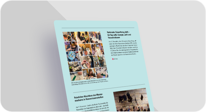 Nationaler Zukunftstag 2025 – Ein Tag voller Energie, Licht und Nanostrukturen Am 13. November, dem Nationalen Zukunftstag, öff- neten das Swiss Nanoscience Institute (SNI), das De- partement Physik und das Basel Quantum Center (BQC) ihre Türen für 20 Mädchen im Alter von 10 bis 13 Jahren. Ein abwechslungsreiches Programm bot den Teilnehmerinnen spannende Einblicke in die Welt der Physik, Quanten- und Nanowissenschaften. SNI-Post Mit viel Eifer und Spass waren unsere Besucherinnen beim Nationalen Zukunftstag 2025 dabei und lernten so eine Menge über Physik und Nano. Feierlicher Abschluss des Master- studiums in Nanowissenschaften Am 7. Novemver fand in der Basler Papiermühle die Masterfeier des Nanostudiums 2025 statt – ein festli- cher und zugleich fröhlicher Anlass, bei dem die Ab- solventinnen und Absolventen ihre wohlverdienten Urkunden entgegennahmen und gemeinsam ihren Abschluss feiern konnten. SNI-Post Video Dieses Jahr fand die Masterfeier für das Nanostudium in der Basler Papier- mühle statt. 37 SNI INSight Dezember 2025