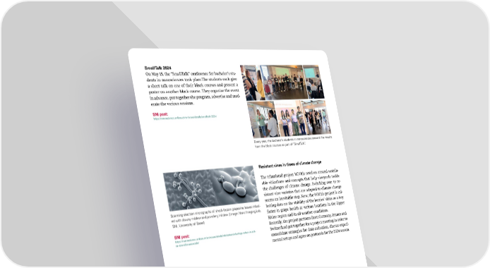 SmallTalk 2024 On May 15, the “SmallTalk” conference for bachelor’s stu- dents in nanosciences took place.The students each give a short talk on one of their block courses and present a poster on another block course. They organize the event in advance, put together the program, advertise and mod- erate the various sessions. SNI post: https://nanoscience.unibas.ch/en/news/details/smalltalk-2024/ Every year, the bachelor’s students in nanosciences present the results from the block courses as part of “SmallTalk”. Resistant vines in times of climate change The trinational project WiVitis revolves around sustain- able viticulture and concepts that help vineyards tackle the challenges of climate change. Switching over to re- sistant vine varieties that are adapted to climate change seems an inevitable step. Now, the WiVitis project is col- Scanning electron micrographs of shock-frozen grapevine leaves infest- lecting data on the stability of the berries’ skins as a key ed with downy mildew and powdery mildew. (Image: Nano Imaging Lab, factor in grape health at various locations in the Upper SNI, University of Basel) Rhine region and in all weather conditions. SNI post: Recently, the project partners from Germany, France and https://nanoscience.unibas.ch/en/news/details/widerstandsfaehige-reben-in-zeit- Switzerland got together for a project meeting in order to en-des-klimawandels/ consolidate strategies for data collection, discuss experi- mental setups and agree on protocols for the 2024 season. Diverse examples of projects in the Nano Imaging Lab The Nano Imaging Lab user event took place in April. In short presentations, six researchers described their research approaches and how they are supported by the Nano Imaging Lab team. The range of research topics re- 昀氀ected the wealth of tasks that the NI Lab deals with on a daily basis. SNI post: https://nanoscience.unibas.ch/de/news/details/vielfaeltige-beispiele-von-projekten-im-na- no-imaging-lab/ The Nano Imaging Lab User Event was a great opportunity to hear from other research groups, learn more about the diverse capabilities of the Nano Imaging Lab and witness the honoring of the Nano Imaging Lab’s two thousandth customer. SNI INSight June 2024 31