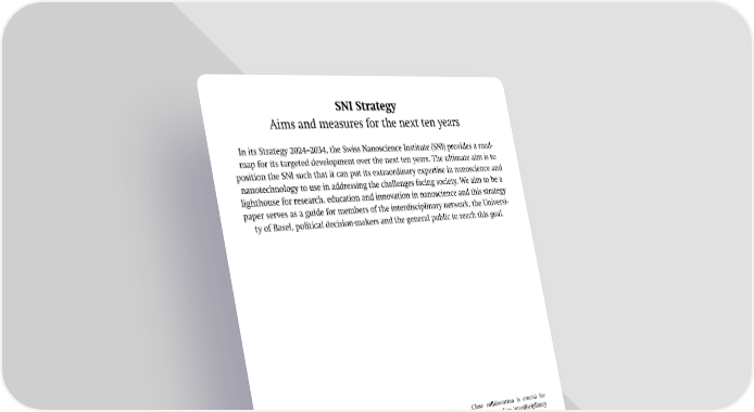 SNI Strategy Aims and measures for the next ten years In its Strategy 2024–2034, the Swiss Nanoscience Institute (SNI) provides a road- map for its targeted development over the next ten years. The ultimate aim is to position the SNI such that it can put its extraordinary expertise in nanoscience and nanotechnology to use in addressing the challenges facing society. We aim to be a lighthouse for research, education and innovation in nanoscience and this strategy paper serves as a guide for members of the interdisciplinary network, the Universi- ty of Basel, political decision-makers and the general public to reach this goal. Four guiding principles Close collaboration is crucial for The SNI’s four guiding principles for the future are to the success of an interdisciplinary focus, collaborate, adapt and impact. network like the SNI. Thanks to the SNI’s established structure, re- Over the next decade, the SNI will searchers from di昀昀erent disciplines focus on the core areas of nanoim- Collaborate and institutions work together on aging and nanofabrication. The SNI’s basic and applied research ques- predecessor institution and the SNI tions. The aim for the future is to itself were founded by scienti昀椀c pio- strengthen identi昀椀cation with the SNI network among neers, who were among the 昀椀rst to its members, to create a stronger sense of “we” and to Focus visualize and manipulate structures communicate the SNI’s achievements together. at the nanoscale. Building on this tra- dition of excellence, we aim to consolidate and expand In order to compete with the best our expertise in these areas. This will help us to address nanoscience centers in the world, challenges in the 昀椀elds of materials science, quantum we must adapt our infrastructure to science, life science, medicine and the environment. As the ever-increasing technological de- part of these e昀昀orts, we will involve all parts of the SNI, mands of the coming years. We will including fundamental and applied research, our service Adapt also continue to modernize the train- units (Nano Imaging and Nano Fabrication Lab), and our ing of young scientists and make the educational program. way in which we present information about our activities more and more attractive. SNI INSight June 2024 4
