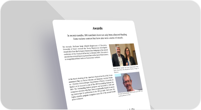 Awards In recent months, SNI members have not only been allocated funding from various sources but have also won a series of awards. For example, Professor Sonja Schmid (Department of Chemistry, University of Basel) received the Young Fluorescence Investigator Award 2024 from the Biological Fluorescence Subgroup at the annual conference of the Biophysical Society in February 2024. This prize is awarded to outstanding young researchers at the start of their careers, in recognition of their work on 昀氀uorescence methods. Sonja Schmid received the Young Fluorescence Inves- tigator Award from the Biophysical Society. (Image: H. Sanabria) At the March Meeting of the American Physical Society (APS), it was announced that our former director and honorary member Profes- sor Christian Schönenberger (Department of Physics, University of Basel) is to be honored as one of the APS Outstanding Referees for 2024. The Outstanding Referee program was launched in 2008 and recognizes scientists who have been exceptionally helpful in assess- ing manuscripts for publication in the APS journals. Each year, this highly selective program recognizes some 150 of the around 91,600 active reviewers. Christian Schönenberger was honored as an APS Out- standing Referee for 2024. Thank you and farewell to Michèle, and welcome to Battist! At the end of June, our long-serving outreach manager Dr. Michèle Wegmann is leaving the SNI to focus more closely on children’s edu- cation as an elementary school teacher. Michèle has been a key contact for outreach activities with children and for parts of the Annual Report, the Nano-Argovia pro- gram and numerous SNI events such as the Annual Event and the NanoTec Apéro. We thank her for her dedication over the last eight years and all of her work to support and advance the interests of the SNI — and we wish her all the best as she takes on this new challenge. The nanoscientist Dr. Battist Utinger will join the SNI’s man- agement team on 1 July. His work will focus on getting pupils and high-school students interested in the nanosciences and informing them about the nanoscience degree with a view to boosting student numbers. Battist will also intensify contact with companies and raise awareness of the SNI’s Nano-Argovia program in Northwestern After eight ful昀椀lling years, Michèle Wegmann is leaving Switzerland, as well as taking over Michèle’s tasks in other areas. We the SNI. Battist Utinger will join the SNI management welcome him and look forward to working together! team in July. 24 SNI INSight June 2024