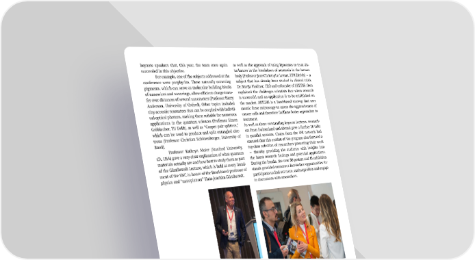 keynote speakers that, this year, the team once again as well as the approach of using liposomes to treat dis- succeeded in this objective. turbances in the breakdown of ammonia in the human For example, one of the subjects addressed at the body (Professor Jean-Christophe Leroux, ETH Zürich) — a conference were porphyrins. These naturally occurring subject that has already been studied in clinical trials. pigments, which can serve as molecular building blocks Dr. Marija Plodinec, CEO and cofounder of ARTIDIS, then of nanowires and nanorings, allow e昀케cient charge trans- explained the challenges scientists face when research fer over distances of several nanometers (Professor Harry is successful and an application is to be established on Anderson, University of Oxford). Other topics included the market. ARTIDIS is a Basel-based start-up that uses tiny acoustic resonators that can be coupled with individ- atomic force microscopy to assess the aggressiveness of ual optical photons, making them suitable for numerous cancer cells and therefore facilitate better approaches to applications in the quantum sciences (Professor Simon treatment. Gröblacher, TU Delft), as well as “Cooper pair splitters,” As well as these outstanding keynote lectures, research- which can be used to produce and split entangled elec- ers from Switzerland and abroad gave a further 36 talks trons (Professor Christian Schönenberger, University of in parallel sessions. Chairs from the SNI network had Basel). ensured that this section of the program also featured a Professor Kathryn Moler (Stanford University, top-class selection of researchers presenting their work CA, USA) gave a very clear explanation of what quantum — thereby providing the audience with insights into materials actually are and how best to study them as part the latest research 昀椀ndings and potential applications. of the Güntherodt Lecture, which is held at every instal- During the breaks, the over 50 posters and 15 exhibition ment of the SNC in honor of the Basel-based professor of stands provided numerous face-to-face opportunities for physics and “nanopioneer” Hans-Joachim Güntherodt. participants to 昀椀nd out more, exchange ideas and engage in discussions with researchers. In their keynote lectures, Kathryn Moler and Sébastien Lecommandoux gave exciting insights into their research. Interdisciplinary exchange was the main focus of the SNC.(Image: E. Byrne) «I enjoyed it greatly and it was wonder- ful to have the chance to be in touch with the Swiss Nano/Quantum community.» Prof. Kathryn Moler, Stanford University, CA, USA Other keynote talks dealt with self-assembling poly- mer-based nanovesicles, which can be loaded with ac- tive pharmaceutical ingredients, and the preparation of more-complex, compartmentalized arti昀椀cial cells (Profes- Over 50 posters offered an ideal opportunity to 昀椀nd out about different sor Lecommandoux, University of Bordeaux). Key topics research approaches and to discuss these with the respective research- in the 昀椀eld of nanomedicine included work on the devel- ers during the poster session. opment of microrobots that can indicate various disease parameters (Professor Simone Schürle-Finke, ETH Zürich), SNI INSight June 2024 26