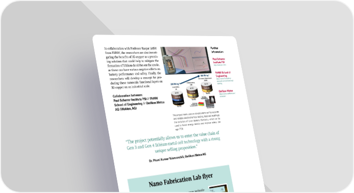 In collaboration with Professor Kaspar Lö昀昀el Further from FHNW, the researchers are also investi- information gating the bene昀椀ts of 3D copper as a promis- ing solution that could help to mitigate the Paul Scherrer formation of lithium dendrites on the anode, Institute PSI as these can have various negative e昀昀ects on https://www.psi.ch/en battery performance and safety. Finally, the FHNW School of researchers will develop a concept for pro- Engineering ducing these nanoscale functional layers on https://www.fhnw.ch/en/ 3D copper on an industrial scale. research-and-services/engi- neering Collaboration between: Oerlikon Metco Paul Scherrer Institute PSI // FHNW https://www.oerlikon.com/ School of Engineering // Oerlikon Metco metco/en/ AG (Wohlen, AG) The project team uses an all-solid-state cell for accurate and reliable electrochemical testing (top) and roadmaps the evolution of Li-ion battery chemistry, which can be used to boost energy density and improve safety. (Im- age: PSI) “The project potentially allows us to enter the value chain of Gen 3 and Gen 4 lithium-metal cell technology with a strong unique selling proposition.” Dr. Phani Kumar Yalamanchili, Oerlikon Metco AG Nano Fabrication Lab 昀氀yer The Nano Fabrication Lab (NF Lab) o昀昀ers numerous technolo- gies and methods to support researchers with the production of micro and nanofabricated components. We provide an overview of the NF Lab’s services in a short 昀氀yer. Nano Fabrication Lab flyer https://bit.ly/4dYGzln Annual Report 2023 In the Annual Report, we look back on the year 2023. In addition to short and concise summaries of highlights in di昀昀erent areas of the SNI, a scienti昀椀c supplement goes into greater depth and describes the results of all projects funded in 2023 over two pages per project. General part Animated version with embedded video, print version Scientific supplement Print version 14 SNI INSight June 2024