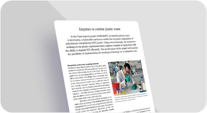 Enzymes to combat plastic waste In the Nano-Argovia project NANOdePET, an interdisciplinary team is developing a sustainable method to enable the enzymatic degradation of polyethylene terephthalate (PET) plastic. Using nanotechnology, the researchers working on the project supramolecularly engineer enzymes to equip them with the ability to degrade PET e昀케ciently. The second phase of the project will examine the possibility of implementing the resulting technology on an industrial scale. Demand for sustainable recycling methods Worldwide, more than 55 million tons of the plastic poly- ethylene terephthalate (PET) are produced every year, and this volume will continue to rise in the future. The main applications are packaging (bottles and 昀椀lms) as well as fabrics and textiles. Accordingly, there is an urgent need for innovative measures to prevent a continuous increase in the environmental burden and to enable the reuse of this versatile polymeric material. Today, in industrial- ized countries, this is primarily achieved by mechanical methods with subsequent melting down and reuse of the material — but this technique produces harmful waste and only allows a limited number of cycles, as the quality of the material decreases with each cycle. Alternative chemical methods developed so far, Amir Nazemi is preparing a protein quanti昀椀cation assay to study the im- which allow processing of the building blocks back into mobilization ef昀椀ciency and measure the amount of enzyme immobilized high-quality PET, are not only energy-intensive and costly on the silica nanoparticles. (Image: FHNW) but also associated with detrimental waste. One solution would involve the enzymatic degradation of PET, but known PET-degrading enzymes are thermally unstable and costly to use. developed by INOFEA to modify the nanoenvironment of Modified enzymes with improved properties PET-depolymerizing enzymes (ester hydrolases) so that Now, a team of researchers from the FHNW School of Life they exhibit higher stability and a better conversion rate Sciences and School of Engineering is working with the than soluble enzymes. start-up INOFEA to develop a sustainable PET-degradation Using nanotechnological methods, natural en- method based on enzymatic hydrolysis. The researchers, zymes are immobilized on a silica core and stabilized led by Professor Patrick Shahgaldian, are using a platform using arti昀椀cial “chaperones.” A coating of organic silica “This collaboration with FHNW, 昀椀nancially supported by the SNI, o昀昀ers INOFEA an opportunity to expand its portfolio of nano-engineered enzymes and address envi- ronmental concerns by providing a sustainable solution to plastic waste. INOFEA expects to gain a competitive edge and meet market demand for environmentally friendly products.” Dr. Rita Correro, INOFEA SNI INSight June 2024 10