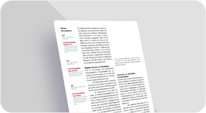 Weitere Mit diesem HS-AFM ermitteln die Forschen- Informationen den dann die nanomechanischen Kräfte, mit denen bestimmte Moleküle (Phenylalanin- SNF Glycon-Nukleoprone = FG Nups) in künst- https://data.snf.ch/grants/ lichen Nanoporen gebunden sind. Die FG grant/220223 Forschungsgruppe Nups spielen in natürlichen Poren in der Roderick Lim Zellkernmembran eine wichtige Rolle beim https://www.biozentrum.unibas. Transport von grossen Molekülen in und aus ch/research/research-groups/ dem Zytoplasma. Durch die Au昀氀ösung der research-groups-a-z/overview/ unit/research-group-roderick- nanomechanischen Kräfte in den künstli- lim chen Poren, erho昀昀en sich die Forschenden auch ein besseres allgemeineres Verständnis über die Wirkung der Kräfte in natürlichen SNF Nanoporen, die mit Proteinen oder Polyme- In dem bewilligten COST-Projekt untersucht das Team https://data.snf.ch/grants/ grant/10000153 ren im Inneren ausgestattet sind. von Roderick Lim, Kräfte zwischen Molekülen und Na- noporen mit einem besonderen Hochgeschwindigkeits- Forschungsgruppe Mögliche Therapie von Gendefekten Rasterkraftmikroskop. Jörg Huwyler Prof. Dr. Jörg Huwyler vom Departement https://pharma.unibas.ch/de/ research/research-groups/phar- Pharmazeutische Wissenschaften hat zu- maceutical-technology-2253/ sammen mit Forschenden von der EPFL und der Universitäts-Kinderklinik ein Sinergia- Verständnis von mikrobiellen Projekt zugesprochen bekommen. Produktionslinien SNF Die Forschenden wollen in dem Pro- In einem vom Schweizer Nationalfond unter- https://data.snf.ch/grants/per- jekt eine neue Generation von stabilen, lange stützten Projekt untersucht die Gruppe von son/542229 wirksamen und sicheren DNA-Therapeutika Prof. Dr. Timm Maier mikrobielle «Fabriken», Forschungsgruppe für die venöse Verabreichung entwicklen. in denen Bakterien und Pilze Polyketide her- Timm Maier Sie konzentrieren sich dabei zu- stellen. Diese hochkomplexen chemischen https://www.biozentrum.unibas. nächst auf Behandlungsmöglichkeiten für Verbindungen unterstützen die Mikroorga- ch/research/research-groups/ eine seltene Sto昀昀wechselerkrankung, die auf nismen in ihrem natürlichen Milieu beim research-groups-a-z/overview/ unit/research-group-timm- einem einzigen Gendefekt beruht und vor Überlebungskampf. Sie besitzen eine stark maier allem Kinder betri昀昀t. Die beteiligten Teams antibiotische Wirkung und sind daher auch planen dazu spezi昀椀sche Lipid-Nanopartikel von Interesse für die Entwicklung neuer Me- zu entwickeln, die mit DNA-Plasmiden be- dikamente. laden werden und spezi昀椀sch an bestimmte Die chemische Herstellung der Po- Rezeptoren auf Leberzellen binden. Anhand lyketide im Labor ist jedoch aufwändig und von in vitro und in vivo Experimenten wer- äussert schwierig. In den Mikroorganismen den die Forschenden die Sicherheit und dagegen erfolgt sie e昀케zient in vergleichs- Wirkung der entwickelten Lipidträger testen weise riesigen Fertigungsstrassen mit vielen und anhand eines Tiermodells analysieren, einzelnen, räumlich gekoppelten Reaktions- ob der untersuchte Gendefekt auf diese Wei- zentren. Nun wollen die Forschenden aus se langanhaltend und sicher ausgeglichen dem Maier-Team mithilfe verschiedener werden kann. Forschende aus dem Team von Jörg Huwyler wollen in einem neuen Sinergia-Projekt stabile, lange wirksame und sichere DNA-Therapeutika für die venöse Verabreichung entwicklen. (Symbolbild Adobe Fire昀氀y) SNI INSight Juni 2024 19