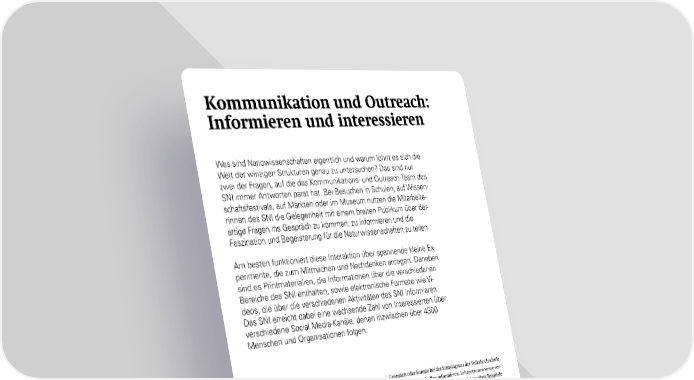 Kommunikation und Outreach: Informieren und interessieren Was sind Nanowissenschaften eigentlich und warum lohnt es sich die Welt der winzigen Strukturen genau zu untersuchen? Das sind nur zwei der Fragen, auf die das Kommunikations- und Outreach-Team des SNI immer Antworten parat hat. Bei Besuchen in Schulen, auf Wissen - schaftsfestivals, auf Märkten oder im Museum nutzen die Mitarbeite- rinnen des SNI die Gelegenheit mit einem breiten Publikum über der- artige Fragen ins Gespräch zu kommen, zu informieren und die Faszination und Begeisterung für die Naturwissenschaften zu teilen. Am besten funktioniert diese Interaktion über spannende kleine Ex- perimente, die zum Mitmachen und Nachdenken anregen. Daneben sind es Printmaterialien, die Informationen über die verschiedenen Bereiche des SNI enthalten, sowie elektronische Formate wie Vi- deos, die über die verschiedenen Aktivitäten des SNI informieren. Das SNI erreicht dabei eine wachsende Zahl von Interessierten über verschiedene Social Media-Kanäle, denen inzwischen über 4300 Menschen und Organisationen folgen. Verschiedene Kanäle Gespräch oder konnte bei der Samstagsuni der Volkshochschule Persönliche Kontakte und Interaktion über Nanowissenschaften informieren. Lehrpersonen sowie ver- über soziale Medien schiedene Schulklassen hatten zudem die Gelegenheit Beispiele aus der Nanoforschung direkt in Laboren, die mit dem SNI as- soziiert sind, kennen zu lernen oder bei Schulbesuchen und bei Zu Beginn des Jahres 2022 war einer der Höhepunkte für das den Science Days im Europa-Park spannende Experimente zu SNI-Team die Eröffnung der Sonderausstellung «Voller Energie» unterschiedlichen Themen durchzuführen. im Museum Burghalde in Lenzburg. Das SNI hat mit der Ein- Alle Interessierten, die nicht die Gelegenheit hatten, sich bei richtung eines Wasserlabors, mit verschiedenen Erklärvideos einem der zahlreichen Anlässe zu informieren, erhielten Infor- und einem Buchbeitrag dazu beigetragen, dass auch diese Aus- mation rund um das SNI über verschiedene Social Media-Kanäle. stellung ein voller Erfolg wurde. Das SNI-Team konnte dann Dazu produzierte das SNI-Team Texte und Videos zu Veranstal- auch im Rahmen mehrerer Workshops Primarschülerinnen und tungen, zum Studium, der Doktorandenschule oder zu spezifi- -schüler mit vielfältigen Experimenten von den ganz besonde- sche Forschungsthemen. Der SNI-YouTube-Kanal wurde im Jahr ren Eigenschaften des Wassers überzeugen. 2022 mehr als 110.000 mal aufgerufen – wobei die SNI-Videos Zahlreiche Kinder und Jugendliche kamen an den gemein- mehr als 2600 Stunden lang wiedergegeben wurden. samen Stand des SNI und des Departements Physik während Eine zentrale Informationsquelle ist zudem die Webseite der tunBasel. Sie hatten hier die Gelegenheit eine eigene Seife des SNI. In der zweiten Jahreshälfte bereiteten die SNI-Mitar- zu kreieren und Experimente rund um Seife zu machen. beitenden einen neuen Internetauftritt vor, der im Januar 2023 In der zweiten Jahreshälfte nahm die Zahl der Veranstaltun- aufgeschaltet wurde. Neben der Webseite modernisierte und gen noch einmal zu und es gab viele Gelegenheiten mit einem vereinfachte das SNI-Team in Zusammenarbeit mit der Agentur breiten Publikum in Kontakt zu treten und über die Aktivitäten STUDIO NEO auch das Logo des SNI und arbeitete daran, die des SNI zu informieren. So kam das SNI-Team beim Rüeblimärt Printmaterialien zu erneuern. in Aarau mit zahlreichen Besucherinnen und Besuchern ins 52 SNI Jahresbericht 2022