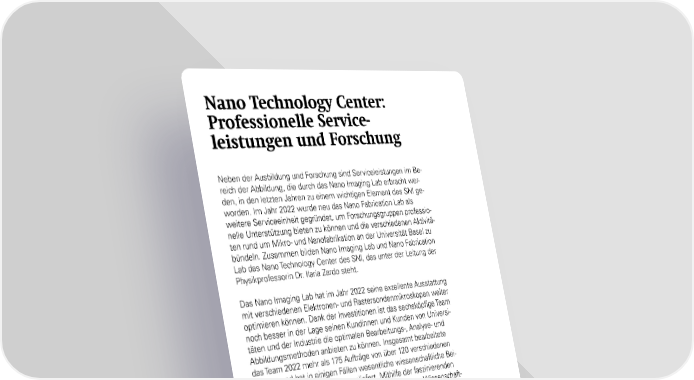 Nano Technology Center: Professionelle Service- leistungen und Forschung Neben der Ausbildung und Forschung sind Serviceleistungen im Be- reich der Abbildung, die durch das Nano Imaging Lab erbracht wer- den, in den letzten Jahren zu einem wichtigen Element des SNI ge- worden. Im Jahr 2022 wurde neu das Nano Fabrication Lab als weitere Serviceeinheit gegründet, um Forschungsgruppen professio- nelle Unterstützung bieten zu können und die verschiedenen Aktivitä- ten rund um Mikro- und Nanofabrikation an der Universität Basel zu bündeln. Zusammen bilden Nano Imaging Lab und Nano Fabrication Lab das Nano Technology Center des SNI, das unter der Leitung der Physikprofessorin Dr. Ilaria Zardo steht. Das Nano Imaging Lab hat im Jahr 2022 seine exzellente Ausstattung mit verschiedenen Elektronen- und Rastersondenmikroskopen weiter optimieren können. Dank der Investitionen ist das sechsköpfige Team noch besser in der Lage seinen Kundinnen und Kunden von Universi- täten und der Industrie die optimalen Bearbeitungs-, Analyse- und Abbildungsmethoden anbieten zu können. Insgesamt bearbeitete das Team 2022 mehr als 175 Aufträge von über 120 verschiedenen Kunden und hat in einigen Fällen wesentliche wissenschaftliche Bei- träge zu Forschungsprojekten geliefert. Mithilfe der faszinierenden Bilder aus der Mikro- und Nanowelt erlangen nicht nur Wissenschaft- ler und Wissenschaftlerinnen neue Erkenntnisse – auch Laien können bei Outreach-Aktivitäten mithilfe der eindrucksvollen Fotos einen Ein- blick in die Welt der winzigen Strukturen erlangen. Im August 2022 startete das Nano Fabrication Lab des SNI seinen Betrieb. Zwei Mitarbeiter haben die für Mikro- und Nanofabrikation notwendige technische Ausrüstung aus verschiedenen Arbeitsgrup- pen des Departements Physik der Universität Basel gebündelt und durch organisatorische Massnahmen die Effizienz und Sicherheit im Reinraumbetrieb verbessert. Jetzt stellen sie die Weichen für die Er- weiterung der Infrastruktur. 2022 nutzten bereits 11 Forschungsgrup- pen mit insgesamt 77 Nutzerinnen und Nutzern der Universität Basel die Dienstleistungen des NF Labs, die wesentlich zu mehreren Publi- kationen in renommierten wissenschaftlichen Zeitschriften beigetra- gen haben. Nano Technology Center: https://nanoscience.unibas.ch/de/services/ 44 SNI Jahresbericht 2022