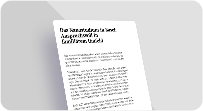 Das Nanostudium in Basel: Anspruchsvoll in familiärem Umfeld Das Nanowissenschaftsstudium an der Universität Basel zeichnet sich durch seine Interdisziplinarität, die praxisnahe Ausbildung, die gute Betreuung und den exzellenten Zusammenhalt unter den Stu- dierenden aus. Schweizweit bietet nur die Universität Basel einen Bachelor- und ei- nen Masterstudiengang in Nanowissenschaften an. Im Bachelorstudi- um bekommen die Studierenden eine breite Grundausbildung in Bio- logie, Chemie, Physik und Mathematik und erhalten Einblick in die wissenschaftliche Arbeit verschiedener Forschungsgruppen und In- dustrieunternehmen. Im Masterstudium wählen die Studierenden aus den Vertiefungsrichtungen Chemie, Medizinische Nanowissen- schaften, Molekularbiologie oder Physik zwei Fächer aus, in denen sie dann zwei Projektarbeiten und eine Masterarbeit absolvieren. Ende 2022 waren 59 Studierende im Bachelorprogramm und 25 im Masterprogramm eingeschrieben. Vier Studierende haben das Bache- lorstudium erfolgreich abgeschlossen, acht haben ihr Studium mit ei- nem Masterabschluss beendet. 12 SNI Jahresbericht 2022