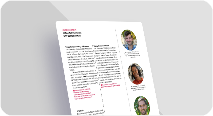 Ausgezeichnet Preise für exzellente SNIDoktorierende Swiss Nanotechnology PhD Award Young Researcher Award Der ehemalige Doktorand der SNI-Dokto- Die ehemalige SNI-Doktorandin Dr. randenschule Dr. Thomas Mortelmans Alexina Ollier hat beim International hat im Rahmen der Swiss NanoConven- Vacuum Congress 2022 in Sapporo Der ehemalige SNI-Doktorand tion 2022 einen der fünf PhD Awards ver- (Japan) einen Young Researcher Thomas Mortelmans erhielt 2022 liehen bekommen. Er erhielt diese von Award verliehen bekommen. Sie er- einen der Swiss Nanotechnology Sensirion gestiftete Auszeichnung für hielt diese von der Canon Anelva Cor- PhD Awards. eine Publikation als Erstautor in dem Wis- poration gestiftete Auszeichnung für senschaftsjournal «ACS Applied Nanoma- ihren Vortrag über elektronische Ei- terials». genschaften von einlagigem, freiem Thomas Mortelmans beschreibt in Graphen. Im Rahmen ihrer vom SNI dieser Veröffentlichung die Entwicklung unterstützten Doktorarbeit arbeitete eines neuartigen Funktionsprinzips für sie mit derartigen atomaren Verbin- COVID-19-Schnelltests, mit dem sich auch dungen und untersuchte Energiever- andere Viren wie Influenza A nachweisen luste in verschiedenen zweidimensi- lassen oder der Status der Krankheit be- onalen Materialien. stimmt werden kann. Bericht: http://bit.ly/3WQihjA Bericht: http://bit.ly/3Y5TLfn Video: https://youtu.be/gzlXDVMMDd0 Video über Veröffentlichung: Die ehemalige SNI-Doktorandin https://youtu.be/7VKskNZCoMc Alexina Ollier bekam 2022 einen Video über die SNIDoktorandenschule: Young Researcher Award. https://youtu.be/9dqX_vimmcY SPSPreis Die Schweizerische Physikalische Gesell- schaft (SPS) hat 2022 dem ehemaligen SNI-Doktoranden Dr. Thomas Karg den von METAS gesponsorten SPS-Preis für Metrologie verliehen. Thomas Karg und seine Kollegen beob- achteten zum ersten Mal eine starke Kopp- Der ehemalige SNI-Doktorand lung zwischen einem nanomechanischen Thomas Karg erhielt 2022 Oszillator und einem atomaren Spin-En- einen SPS-Preis. semble. Sie verwendeten dazu einen neu- artigen Ansatz, bei dem die beiden Sys- teme durch Licht über eine makroskopi- sche Distanz gekoppelt werden. Diese Er- gebnisse ermöglichen neue Anwendun- gen, die von der Quantenmetrologie und der Vernetzung bis hin zu Quantenrück- kopplungsexperimenten und kohärenten Verbindungen zwischen Quantenprozes- soren reichen. Sie wurden im Wissen- schaftsjournal «Science» veröffentlicht. Bericht: http://bit.ly/3YHZ314 20 SNI Jahresbericht 2022