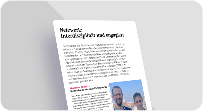 Netzwerk: Interdisziplinär und engagiert Die Grundlage aller Aktivitäten des SNI bildet das Netzwerk, zu dem For- schende aus verschiedenen Departementen der Universität Basel wie Biomedizin, Chemie, Physik, Pharmazeutische Wissensc haften, Umwelt - wissenschaften und Biozentrum gehören sowie Mitglieder aus For- schungsgruppen an den Hochschulen für Life Sciences und Technik der Fachhochschule Nordwestschweiz in Muttenz und Windisch, am Paul Scherrer Institut, am Departement Biosysteme der ETH Zürich in Basel, am Centre Suisse d’Electronique et de Microtechnique (CSEM) in All - schwil sowie am Technologietransferzentrum ANAXAM. Zum erweiterten Netzwerk zählen ausserdem das Hightech Zentrum Aargau in Brugg so - wie Basel Area Business & Innovation, über die Wissens- und Technolo- gietransfer gefördert wird. Wechsel an der Spitze Martino Poggio wird neuer Direktor des SNI Zum 1. August 2022 hat Professor Dr. Martino Poggio die Lei- tung des SNI von Professor Dr. Christian Schönenberger, der das SNI sechszehn Jahr lang geführt hat, übernommen. Der Physiker Martino Poggio kam 2009 als Argovia-Professor an die Universität Basel und engagiert sich seither im SNI- Netzwerk. Mit seiner Forschungsgruppe am Departement Phy- sik beschäftigt er sich mit Themen aus der Nanomechanik, dem Nanomagnetismus und dem Nanoimaging. Bei der Führung des SNI wird Martino Poggio von seinem Stellvertreter Professor Dr. Patrick Maletinsky sowie von dem SNI-Exekutivkomitee unterstützt. Mit der Neubesetzung dieses strategischen Führungsgremiums wurden verschiedene Ver- antwortlichkeiten an Mitglieder des Exekutivkomitees über- tragen. Bericht: http://bit.ly/40mpqvb Die neuen Mitglieder des SNI-Exekutivkomitees vertreten Partnerinstitutionen Patrick Maletinsky (links) unterstützt als Vizedirektor Martino Poggio (rechts), und Departemente im SNI-Netzwerk. Auch für das Doktorats- und das Nano- der seit August 2022 das Swiss Nanoscience Institute als Direktor leitet. Argovia-Programm sowie für die Serviceeinheiten des Nano Technology Cen- ters übernimmt je ein Mitglied die Verantwortung. 50 SNI Jahresbericht 2022