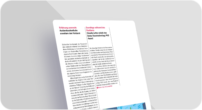 Erfahrung sammeln Grundlage während des Auslandsaufenthalte Studiums erweitern den Horizont Claudia Lotter erhielt den Swiss Nanotechnology PhD Award Zahlreiche Studierende des Nanostudi- ums sammeln während ihres Masterstu- diums Erfahrung im Ausland und bean- Die ehemalige Studentin der Nanowissen- tragen zur finanziellen Unterstützung schaften Claudia Lotter hat im Rahmen Argovia Travel Grants. Durch die Corona- ihrer Masterarbeit am Departement Phar- Pandemie konnten einige Studierende mazeutische Wissenschaften der Univer- ihre geplanten Auslandsaufenthalte je- sität Basel untersucht, wie sich Lipid-Na- doch nicht antreten. Im Jahr 2022 hat sich nopartikel, die für die Gentherapie ent- die Situation wieder etwas normalisiert, wickelt werden, durch die Zusammenset- sodass Studierende ihre Masterarbeiten zung der Lipide optimieren lassen. an verschiedenen internationalen Univer- Sie hat diese Arbeiten im ersten Jahr sitäten absolvieren konnten und durch ihrer Doktorarbeit beendet und die Er- das Argovia Travel Grant-Programm Un- gebnisse im «European Journal of Phar- terstützung bekamen. maceutics and Biopharmaceutics» publi- Milan Liepelt hat an der University of ziert. Für diese Veröffentlichung bekam California Los Angeles (USA) seine Mas- sie im Sommer 2022 anlässlich der Swiss terarbeit im Bereich Quantenbiologie ge- NanoConvention einen Swiss Nanotech- schrieben. Philippe van der Stappen war nology PhD Award, der vom Hightech an der Monash University in Melbourne Zentrum Aargau gestiftet worden war. (Australien), um Zellregionen zu untersu- Bericht: http://bit.ly/3wDFISD chen, die für die Bewegung von Zellen verantwortlich sind. Tamara Utzinger un- tersucht im Rahmen ihrer Masterarbeit an der University of California San Fran- cisco (USA) Immunzellen, welche die Blut- hirnschranke durchdringen und bei neu- rodegenerativen Erkrankungen im Ge- hirn Entzündungen auslösen können. Nicolai Jung hat mit seiner Forschung an der Harvard University (USA) zur Impf- stoffentwicklung gegen Malariaparasiten beigetragen. Mobilität Nanostudium: http://bit.ly/3Jss64m Bericht Nicolai Jung: http://bit.ly/3Y7Lbgd «Ich würde allen Studierenden empfehlen, auch einige Zeit im Ausland zu verbringen. Viel leicht ist es anfangs mit Zusatz arbeit verbunden, aber es lohnt sich auf jeden Fall!» Nicolai Jung ehemaliger Nanostudent und jetzt Forschungsassistent am Walter and Eliza Hall Institute of Medical Research in Melbourne Claudia Lotter bekam im Rahmen der Swiss Nano- (Australien) Convention 2022 den Swiss Nanotechnology PhD Award von Marcus Morstein (Hightech Zentrum Aargau) überreicht. (Bild: T. Byrne) 14 SNI Jahresbericht 2022