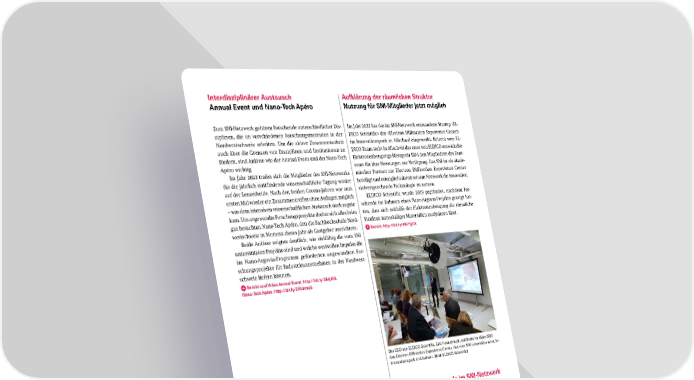 Interdisziplinärer Austausch Aufklärung der räumlichen Struktur Annual Event und NanoTech Apéro Nutzung für SNIMitglieder jetzt möglich Zum SNI-Netzwerk gehören Forschende unterschiedlicher Dis- Im Jahr 2022 hat das im SNI-Netzwerk entstandene Startup «EL- ziplinen, die an verschiedenen Forschungsinstituten in der DICO Scientific» das «Electron Diffraction Experience Center» Nordwestschweiz arbeiten. Um die aktive Zusammenarbeit im Innovationspark in Allschwil eingeweiht. Betreut vom EL- auch über die Grenzen von Disziplinen und Institutionen zu DICO-Team steht in Allschwil das erste von ELDICO entwickelte fördern, sind Anlässe wie der Annual Event und der Nano-Tech Elektronenbeugungs-Messgerät ED-1 den Mitgliedern des Zent- Apéro wichtig. rums für ihre Messungen zur Verfügung. Das SNI ist als akade- Im Jahr 2022 trafen sich die Mitglieder des SNI-Netzwerks mischer Partner am Electron Diffraction Experience Center für die jährlich stattfindende wissenschaftliche Tagung wieder beteiligt und ermöglicht damit seinem Netzwerk die innovative, auf der Lenzerheide. Nach den beiden Corona-Jahren war zum vielversprechende Technologie zu nutzen. ersten Mal wieder ein Zusammentreffen ohne Auflagen möglich ELDICO Scientific wurde 2019 gegründet, nachdem For- – was dem intensiven wissenschaftlichen Austausch stark zugute schende im Rahmen eines Nano-Argovia-Projekts gezeigt hat- kam. Um angewandte Forschungsprojekte drehte sich alles beim ten, dass sich mithilfe der Elektronenbeugung die räumliche gut besuchten Nano-Tech Apéro, den die Fachhochschule Nord- Struktur nanoskaliger Materialien analysieren lässt. westschweiz in Muttenz dieses Jahr als Gastgeber ausrichtete. Bericht: http://bit.ly/40oYgUA Beide Anlässe zeigten deutlich, wie vielfältig die vom SNI unterstützten Projekte sind und welche wertvollen Impulse die im Nano-Argovia-Programm geförderten angewandten For- schungsprojekte für Industrieunternehmen in der Nordwest- schweiz liefern können. Bericht und Video Annual Event: http://bit.ly/3E4jH3L NanoTech Apéro: http://bit.ly/3RUmnq5 Der CEO von ELDICO Scientific, Eric Hovestreydt, eröffnete im März 2022 das Electron Diffraction Experience Center, das vom SNI unterstützt wird, im Innovationspark in Allschwil. (Bild: ELDICO Scientific) Erfolgreiche Forschende im SNINetzwerk Zahlreiche Beförderungen und Preise Der Nano-Tech Apéro bietet SNI-Mitgliedern und interessierten Forschenden aus der Industrie die Möglichkeit sich über laufende Nano-Argovia-Projekte Zahlreiche Forschende aus dem SNI-Netzwerk erhielten im Jahr zu informieren und Kontakte zum Netzwerk zu knüpfen. 2022 Auszeichnungen oder wurden befördert. Die Physikerin Prof. Dr. Jelena Klinovaja und der Biophysiker Verschränkung Prof. Dr. Michael Nash erhielten einen ERC Consolidator Grant. Dem Chemiker Prof. Dr. Stefan Willitsch wurde ein SNSF Ad- Nobelpreiswürdig und im SNI vanced Grant zugesprochen und die Chemikerin Prof. Dr. Mu- ein wichtiges Forschungsthema rielle Delley erhielt einen SNSF Starting Grant. Murielle Delley wurde zur Assistenzprofessorin für Anorga- nische Chemie ernannt. Im Jahr 2022 wurde ebenfalls bekannt Im Jahr 2022 wurde der Nobelpreis in Physik an drei Forschende gegeben, dass die Professoren Dr. Sebastian Hiller, Dr. Timm verliehen, die bahnbrechende experimentelle Forschung mit Maier und Dr. Dominik Zumbühl zum Full Professor ernannt verschränkten Lichtteilchen durchgeführt haben. Auch im werden. SNI-Netzwerk arbeiten einige Forschungsgruppen mit ver- schränkten Teilchen und tragen so zur Entwicklung neuer Me- thoden und Technologien in der Quantenphysik bei. Bericht: https://bit.ly/3jwQNls SNI Jahresbericht 2022 51