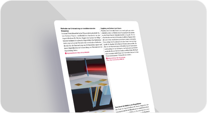 Methoden zur Untersuchung von zweidimensionalen Kopplung von ElektronLochPaaren Materialien Physikern der Universität Basel ist es erstmals gelungen, unter- In einem Übersichtsartikel in der Wissenschaftszeitschrift «Na- schiedliche Arten von Elektron-Loch-Paaren (Exzitonen) in dem ture Reviews Physics» veröffentlichten Forschende um den van-der-Waals-Material Molybdändisulfid zu koppeln. Die For- Argovia-Professor Dr. Martino Poggio eine Analyse der bildge- schenden können dadurch die unterschiedlichen Eigenschaften benden Verfahren für schwache Magnetfelder. Die Publikation der zwei Arten von Elektron-Loch-Paaren nutzen und regeln. liefert eine technische Übersicht über verschiedene Methoden, Diese erfolgreiche Kopplung könnte dazu dienen eine neuartige die sich für die Untersuchung von 2D-Materialien eignen und Quelle für einzelne Lichtteilchen (Photonen) herzustellen. Zu- damit Möglichkeiten zur Untersuchung von Phänomenen wie dem ist die Untersuchung und Modellierung der Exziton-Exzi- Supraleitung bieten. ton-Kopplung für das Verständnis der fundamentalen Halblei- Originalpublikation: https://bit.ly/3HMy2DX terphysik relevant. Die Forschenden veröffentlichten die Ergeb- nisse zusammen mit Kollegen der Universität Toulouse in dem Wissenschaftsjournal «Physical Review Letters». Medienmitteilung: http://bit.ly/3jevLbg Video: https://youtu.be/Sq_KVBM_WzI Neue Sonde für Abbildung von Magnetfeldern Das Team von Argovia-Professor Dr. Martino Poggio hat eine neue Rastersonde für die Mikroskopie von supraleitenden Quan- teninterferenzgeräten (SQUID) im Nanometerbereich entwi- ckelt, die auf einem berührungslosen Rasterkraftmikroskopie- Cantilever basiert. Mit der Sonde ist die Bildgebung von mag- netischen Feldern mit einer räumlichen Auflösung im Nanome- terbereich möglich. Die Veröffentlichung in dem Wissenschafts- journal «Physical Review Applied» ist ein Beitrag zu einem FET- Open-Projekt, das vom Poggio-Team geleitet wird. Originalpublikation: https://bit.ly/3YwAZyj Forschende aus dem SNI-Netzwerk haben verschiedene Abbildungsmetho- den für schwache Magnetfelder, die eine Auflösung im Nanometermassstab ermöglichen, verglichen. (Bilder: Departement Physik, Universität Basel) Die neue Sonde ermöglicht die hochaufgelöste Abbildung von schwachen magnetischen Feldern. (Bild: Departement Physik, Universität Basel) 30 SNI Jahresbericht 2022