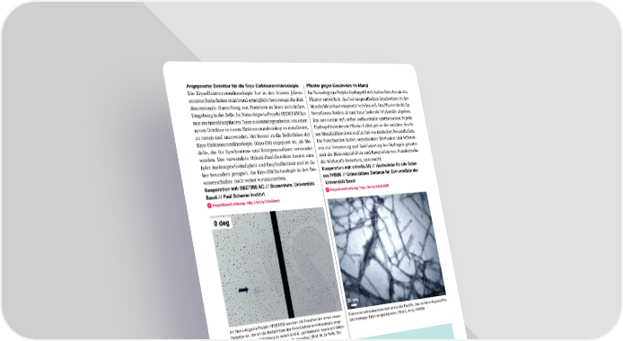 Angepasster Detektor für die KryoElektronenmikroskopie Pflaster gegen Geschwüre im Mund Die Kryo-Elektronenmikroskopie hat in den letzten Jahren Im Nano-Argovia-Projekt Hydrogel-Patch haben Forschende ein enorme Fortschritte erzielt und ermöglicht heutzutage die drei- Pflaster entwickelt, das bei unspezifischen Geschwüren in der dimensionale Darstellung von Proteinen in ihrer natürlichen Mundschleimhaut eingesetzt werden soll. Das Pflaster deckt die Umgebung in der Zelle. Im Nano-Argovia-Projekt HPDET-EM hat betroffenen Stellen ab und kann heilende Wirkstoffe abgeben. nun ein interdisziplinäres Team zusammengearbeitet, um einen Das aus einem sich selbst aufbauenden synthetischen Peptid- neuen Detektor in einem Elektronenmikroskop zu installieren, Hydrogel bestehende Pflaster haftet gut an der weichen, feuch- zu testen und anzuwenden, der besser an die Bedürfnisse der ten Mundschleimhaut und ist frei von tierischen Bestandteilen. Kryo-Elektronenmikroskopie (Kryo-EM) angepasst ist, als Mo- Die Forschenden haben verschiedene Methoden und Substan- delle, die für Synchrotron- und Röntgenanalysen verwendet zen zur Vernetzung und Stabilisierung des Hydrogels getestet werden. Der verwendete Hybrid-Pixel-Detektor besitzt eine und die Biokompatibilität und Integration von Nanokapseln, hohe Auslesegeschwindigkeit und Empfindlichkeit und ist da- die Wirkstoffe freisetzen, untersucht. her besonders geeignet, die Kryo-EM-Technologie in den Bio- Kooperation mit: vVardis AG // Hochschule für Life Scien wissenschaften noch weiter voranzutreiben. ces FHNW // Universitäres Zentrum für Zahnmedizin der Kooperation mit: DECTRIS AG // Biozentrum, Universität Universität Basel Basel // Paul Scherrer Institut Projektbeschreibung: http://bit.ly/40kKWQR Projektbeschreibung: http://bit.ly/3HoWavb Im Nano-Argovia-Projekt HPDET-EM wenden die Forschenden einen neuen Elektronenmikroskopische Aufnahme des Peptids, das im Nano-Argovia-Pro- Detektor an, der an die Bedürfnisse der Kryo-Elektronenmikroskopie ange- jekt Hydrogel-Patch eingesetzt wird. (Bild: L. Kind, FHNW) passt ist. Auf der Abbildung zu sehen sind E. coli-Bakterien sowie ein Bakte- riophage (mit dem Pfeil markiert) und Goldpartikel. (Bild: M. Er-Rafik, Bio- zentrum, Universität Basel) «Das NanoArgovia Projekt unterstützt unsere An «Wir sind zuversichtlich, dass uns diese Zusammen strengungen innovative und intelligente Regenerati arbeit helfen wird, eine entscheidende Rolle in dem onssysteme für orale Anwendungen zu entwickeln.» wichtigen neuen Marktsegment der Kryo Michael Hug, Co-CSO bei vVardis AG Elektronenmikroskopie zu spielen.» Dr. Sacha de Carlo, Global Sales Manager EM bei Dectris AG SNI Jahresbericht 2022 39