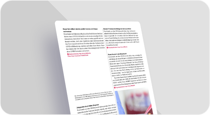 Neuer Schnelltest könnte parallel Corona und Grippe Bessere Probenvorbereitung mit dem cryoWriter nachweisen Forschende aus dem SNI-Netzwerk haben eine verbesserte Forschende der Universität Basel und des Paul Scherrer Instituts mikrofluidische Probenvorbereitung für die Elektronenmikros- haben einen COVID-19-Schnelltest mit einem neuartigen Funk- kopie vorgestellt. Sie vermeiden mit ihrer Methode das soge- tionsprinzip entwickelt. Noch muss er weiter geprüft und ver- nannte Papierblotting, das zu einem hohen Verlust der Proteine bessert werden, doch erste Ergebnisse sind vielversprechend: führt. Zum anderen optimieren sie die Bedingungen derart, dass Der Test verspricht nicht nur Resultate über das Vorliegen einer es zu deutlich weniger Schäden der Probe an der Luft-Wasser- COVID-19-Erkrankung, sondern auch über ihren Status. Dane- Grenzfläche kommt. ben könnte der Test auch andere Erkrankungen und verschie- Originalpublikation: https://bit.ly/3HICnrQ dene COVID-Varianten nachweisen. Medienmitteilung: http://bit.ly/3WPpmko Video: https://youtu.be/7VKskNZCoMc Neuer Ansatz in der Biosensorik Forschende aus dem SNI-Netzwerk haben eine neuartige Be- schichtung aus einem Polymer und Kohlenstoffnanoröhrchen entwickelt, die sich für die Beschichtung von miniaturisierten Elektroden eignet. Derartige Elektroden, bei denen leitfähige Nanomaterialien in eine abweisende Matrix eingebettet sind, können in der patientennahen Labordiagnostik eingesetzt wer- den. Die neuartige Beschichtung schützt die Elektroden vor Verschmutzung – was bei komplexen Proben wie Blutserum immer wieder ein Problem darstellt. Das Swiss Nanoscience Institute hat diese Zusammenarbeit von Forschenden des CSEM, der Hochschule für Life Sciences FHNW und der Firma MOMM Diagnostics im Rahmen seines angewandten Forschungsprogramms Nano-Argovia gefördert. Originalpublikation: https://bit.ly/3HkESPA Der ehemalige SNI-Doktorand Thomas Mortelmans hat im Rahmen seiner Doktorarbeit in der SNI-Doktorandenschule einen Schnelltest für Infektionen mit SARS-CoV-2 entwickelt. (Foto: Paul Scherrer Institut/Mahir Dzambegovic) Zeitgewinn durch frühe Diagnose Forschende aus dem SNI-Netzwerk haben gezeigt, dass sich na- nomechanische Sensoren bestens eignen, um schon wenige Bakterienkeime im Blut schnell und zuverlässig nachzuweisen. Das interdisziplinäre Team beschreibt im Wissenschaftsjournal «Biosensors», dass sich mit der Methode eine Sepsis schon in einem frühen Stadium diagnostizieren lässt – was mehr Zeit für eine erfolgreiche Behandlung gibt. Originalpublikation: http://bit.ly/3Rjk2VF Blutprobe mit Bakterien Bakterien innerhalb von Minuten nachge- wiesen Mit einem nanomechanischen Sensor lassen sich wenige Bakterien in einer Eine neue Beschichtung von miniaturisierten Elektroden für die patientenna- Blutprobe nachweisen. (Bild: Departement Physik, Universität Basel) he Labordiagnostik verhindert Verunreinigungen – ein Problem bei komple- xen Proben wie Blutserum. (Bild: CSEM Allschwil) SNI Jahresbericht 2022 25