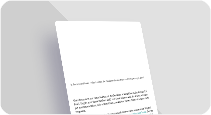 Studium Nanowissenschaften an der Universität Basel Page 10 Page 12«Das Besondere am Nanostudium ist der enge Kontakt zu anderen Studierenden sowie zu den Lehrpersonen.»Charlotte Kress, ehemalige Studentin der Nanowissenschaften an der Universität BaselIn Pausen und in der Freizeit nutzen die Studierenden die schöne Umgebung in Basel.