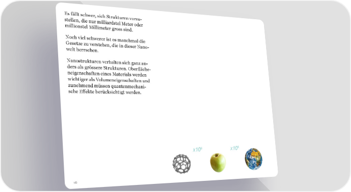 Es fällt schwer, sich Strukturen vorzu- stellen, die nur milliardstel Meter oder millionstel Millimeter gross sind. Noch viel schwerer ist es manchmal die Gesetze zu verstehen, die in dieser Nano- welt herrschen. Nanostrukturen verhalten sich ganz an- ders als grössere Strukturen. Ober昀氀äche- neigenschaften eines Materials werden wichtiger als Volumeneigenschaften und zunehmend müssen quantenmechani- sche E昀昀ekte berücksichtigt werden. x108 x108 10