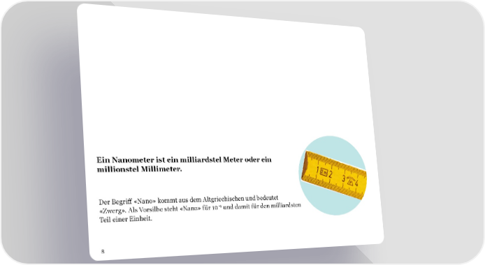 Ein Nanometer ist ein milliardstel Meter oder ein millionstel Millimeter. Der Begri昀昀 «Nano» kommt aus dem Altgriechischen und bedeutet -9 «Zwerg». Als Vorsilbe steht «Nano» für 10 und damit für den milliardsten Teil einer Einheit. 8