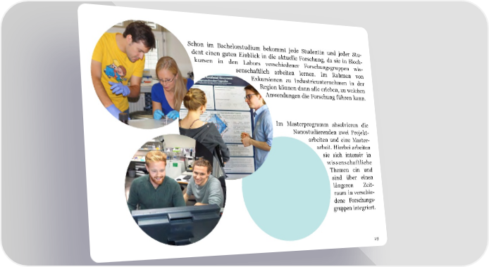 Schon im Bachelorstudium bekommt jede Studentin und jeder Stu- dent einen guten Einblick in die aktuelle Forschung, da sie in Block- kursen in den Labors verschiedener Forschungsgruppen wis- senschaftlich arbeiten lernen. Im Rahmen von Exkursionen zu Industrieunternehmen in der Region können dann alle erleben, zu welchen Anwendungen die Forschung führen kann. Im Masterprogramm absolvieren die Nanostudierenden zwei Projekt- arbeiten und eine Master- arbeit. Hierbei arbeiten sie sich intensiv in wissenschaftliche Themen ein und sind über einen längeren Zeit- raum in verschie- dene Forschungs- gruppen integriert. 29