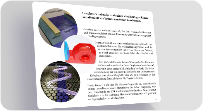 Graphen wird aufgrund seiner einzigartigen Eigen- schaften oft als Wundermaterial bezeichnet. Graphen ist ein weiteres Material, das den Wissenschaftlerinnen und Wissenschaftlern erst seit Kurzem für ihre Untersuchungen zur Verfügung steht. Graphen besteht aus einer zweidimensionalen Schicht von Kohlensto昀昀atomen, die wabenartig angeordnet sind. Es ist ein hervorragender Leiter von Strom und Wärme, 300-mal zugfester als Stahl dabei aber 昀氀exibel und transparent. Erst 2004 stellten die beiden Wissenschaftler Konstan- tin Novoselov und Andre Geim Graphen erstmals her und zwar mit einer erstaunlich einfachen Methode. Sie lösten nämlich diese nur ein Atom dicke Schicht mit transparentem Klebeband von einem Graphitkristall ab. 2010 bekamen sie für diese Entdeckung den Nobelpreis für Physik verliehen. Heute können nicht nur die dünnen Graphenfolien, sondern auch andere zweidimensionale Materialien im Labor hergestellt wer- den. Forschende am SNI kombinieren verschiedene dieser dünnen Schichten – in der Ho昀昀nung, Materialkombinationen mit ganz neu- en Eigenschaften zu identi昀椀zieren. 23