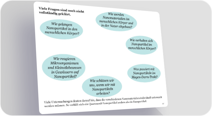 Viele Fragen sind noch nicht Wie werden vollständig geklärt. Nanomaterialien im menschlichen Körper und Wie gelangen in der Natur abgebaut? Nanopartikel in den menschlichen Körper? Wie verhalten sich Nanopartikel im menschlichen Körper? Wie reagieren Mikroorganismen und Kleinstlebewesen Was passiert mit in Gewässern auf Nanopartikeln im Nanopartikel? Magen-Darm-Trakt? Wie schützen wir uns, wenn wir mit Nanopartikeln arbeiten? Viele Untersuchungen deuten darauf hin, dass die verschiedenen Nanomaterialien individuell untersucht werden müssen. So verhält sich ein Quarzsand-Nanopartikel anders als ein Russpartikel. 27