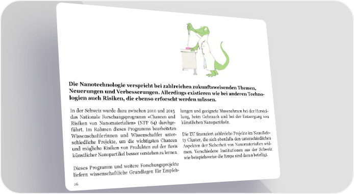 Die Nanotechnologie verspricht bei zahlreichen zukunftsweisenden Themen, Neuerungen und Verbesserungen. Allerdings existieren wie bei anderen Techno- logien auch Risiken, die ebenso erforscht werden müssen. In der Schweiz wurde dazu zwischen 2010 und 2015 lungen und geeignete Massnahmen bei der Herstel- das Nationale Forschungsprogramm «Chancen und lung, beim Gebrauch und bei der Entsorgung von Risiken von Nanomaterialien» (NFP 64) durchge- künstlichen Nanopartikeln. führt. Im Rahmen dieses Programms bearbeiteten Wissenschaftlerinnen und Wissenschaftler unter- Die EU 昀椀nanziert zahlreiche Projekte im NanoSafe- schiedliche Projekte, um die wichtigsten Chancen ty Cluster, die sich ebenfalls den unterschiedlichen und mögliche Risiken von Produkten auf der Basis Aspekten der Sicherheit von Nanomaterialien wid- künstlicher Nanopartikel besser verstehen zu lernen. men. Verschiedene Institutionen aus der Schweiz wie beispielsweise die Empa sind daran beteiligt. Dieses Programm und weitere Forschungsprojekte liefern wissenschaftliche Grundlagen für Empfeh- 26