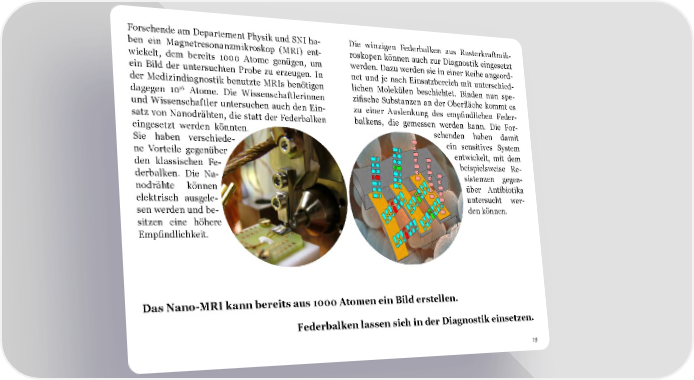 Forschende am Departement Physik und SNI ha- Die winzigen Federbalken aus Rasterkraftmik- ben ein Magnetresonanzmikroskop (MRI) ent- roskopen können auch zur Diagnostik eingesetzt werden. Dazu werden sie in einer Reihe angeord- wickelt, dem bereits 1000 Atome genügen, um ein Bild der untersuchten Probe zu erzeugen. In net und je nach Einsatzbereich mit unterschied- der Medizindiagnostik benutzte MRIs benötigen lichen Molekülen beschichtet. Binden nun spe- 16 dagegen 10 Atome. Die Wissenschaftlerinnen zi昀椀sche Substanzen an der Ober昀氀äche kommt es und Wissenschaftler untersuchen auch den Ein- zu einer Auslenkung des emp昀椀ndlichen Feder- satz von Nanodrähten, die statt der Federbalken balkens, die gemessen werden kann. Die For- eingesetzt werden könnten. schenden haben damit Sie haben verschiede- ein sensitives System ne Vorteile gegenüber entwickelt, mit dem den klassischen Fe- beispielsweise Re- derbalken. Die Na- sistenzen gegen- nodrähte können über Antibiotika elektrisch ausgele- untersucht wer- sen werden und be- den können. sitzen eine höhere Emp昀椀ndlichkeit. Das Nano-MRI kann bereits aus 1000 Atomen ein Bild erstellen. Federbalken lassen sich in der Diagnostik einsetzen. 19