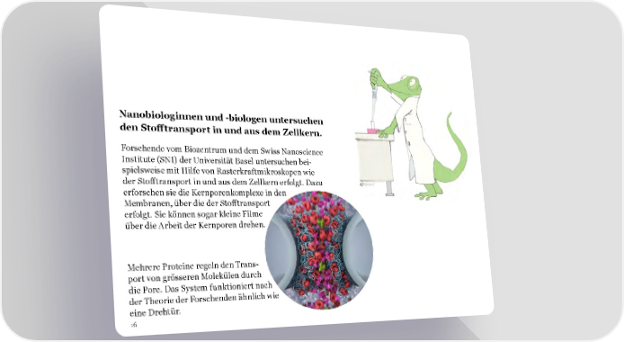 Nanobiologinnen und -biologen untersuchen den Sto昀昀transport in und aus dem Zellkern. Forschende vom Biozentrum und dem Swiss Nanoscience Institute (SNI) der Universität Basel untersuchen bei- spielsweise mit Hilfe von Rasterkraftmikroskopen wie der Sto昀昀transport in und aus dem Zellkern erfolgt. Dazu erforschen sie die Kernporenkomplexe in den Membranen, über die der Sto昀昀transport erfolgt. Sie können sogar kleine Filme über die Arbeit der Kernporen drehen. Mehrere Proteine regeln den Trans- port von grösseren Molekülen durch die Pore. Das System funktioniert nach der Theorie der Forschenden ähnlich wie eine Drehtür. 16
